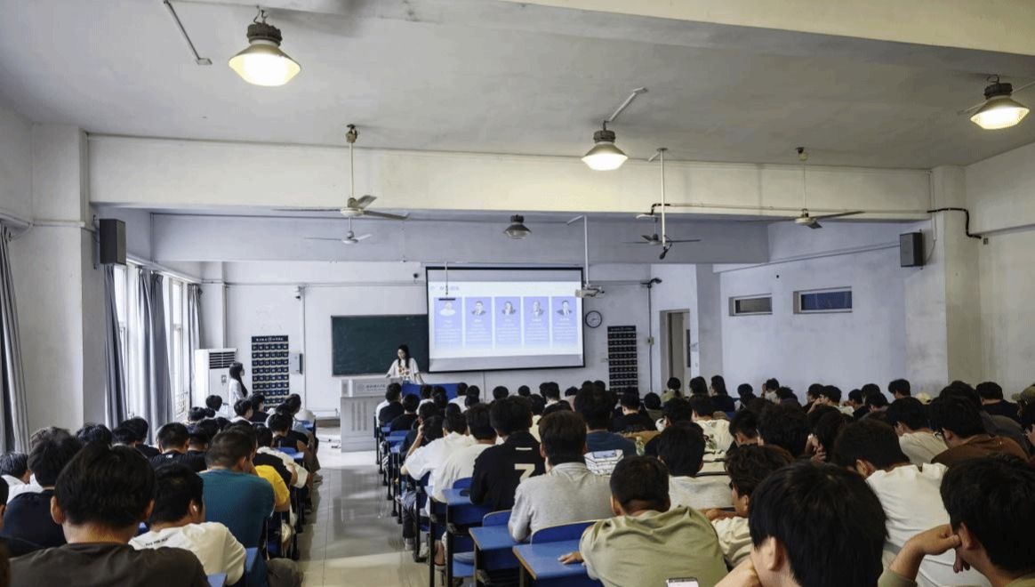当天下午,实习生专场招聘会在逸夫楼A102教室顺利举行,吸引了2026届毕业班近200名学生参加,招聘会现场座无虚席。本次活动由汪中老师主持,梁瑞担任宣讲人。梁瑞详细介绍了公司的组织结构、企业环境、发展通道以及本次招聘的岗位需求。