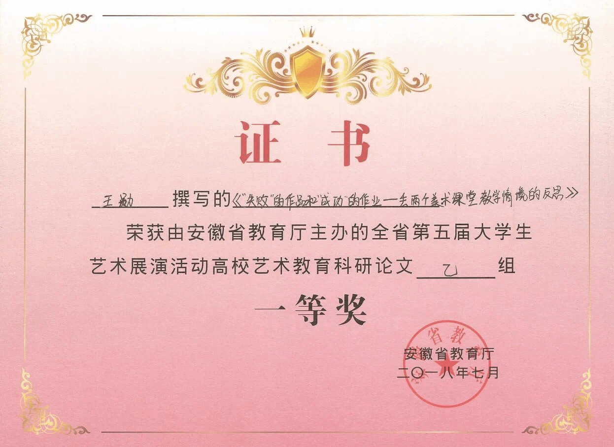 四十年来,美术学专业立足区域发展需要,致力于应用型人才培养,将美术技能与美术教学技能融通,实施“双师”教学,聚焦“三笔三能”理念,培养课堂教学能力、专业技术能力和教学研究能力。以产出为导向,培养“教育理论新、学科知识新、教学技能新”,善于教学,能美术创作,会学生管理的新时代美术教师。近五年,学生获得第十届“挑战杯”安徽省大学生创业计划竞赛金奖、长三角地区美术师范生教学技能大赛一等奖、全国首届美术学科大中小一体化课程思政大赛二等奖、安徽省高等学校师范生教学技能竞赛二等奖;获得国家级大学生创新创业训练计划项目5项,省级以上专业赛事获奖100余项。