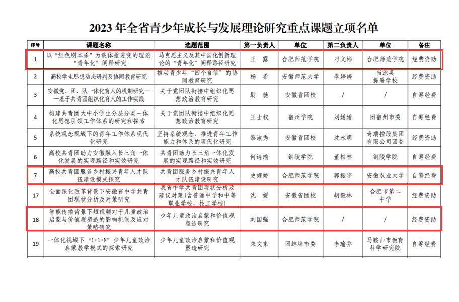 本网讯 近日,由团省委、省教育厅、省学联、省少工委联合发布的《2023年全省青少年成长与发展理论研究重点课题立项名单》公布,我院教师王露《以“红色剧本杀”为载体推进党的理论“青年化”阐释研究》、史娌娇《高校共青团服务乡村振兴青年人才队伍建设模式探究》和刘国强《智能传播背景下短视频对于儿童政治启蒙与价值观塑造的影像机制及应对策略研究》等3个项目喜获立项。在此次公布的20项重点课题中,我院获批立项数量位居申报单位第一。