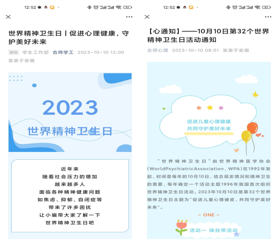 同时,心理健康教育中心编印了“精神卫生日”彩色宣传折页,发放给在校学生,并在“合师学工”“合师心理”公众号平台发布精神卫生科普文章,形成线上线下协调联动,在宣传精神卫生健康知识同时,提供了学院心理中心与权威精神卫生机构的心理服务热线,为同学们提供及时贴心的心理服务。