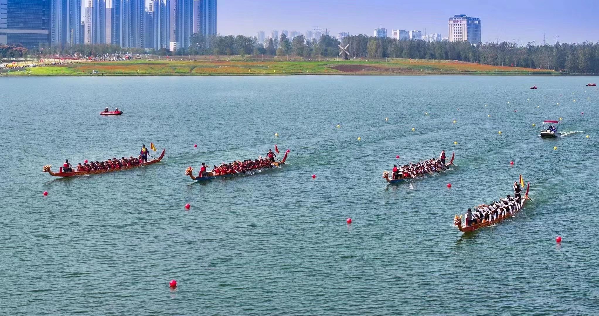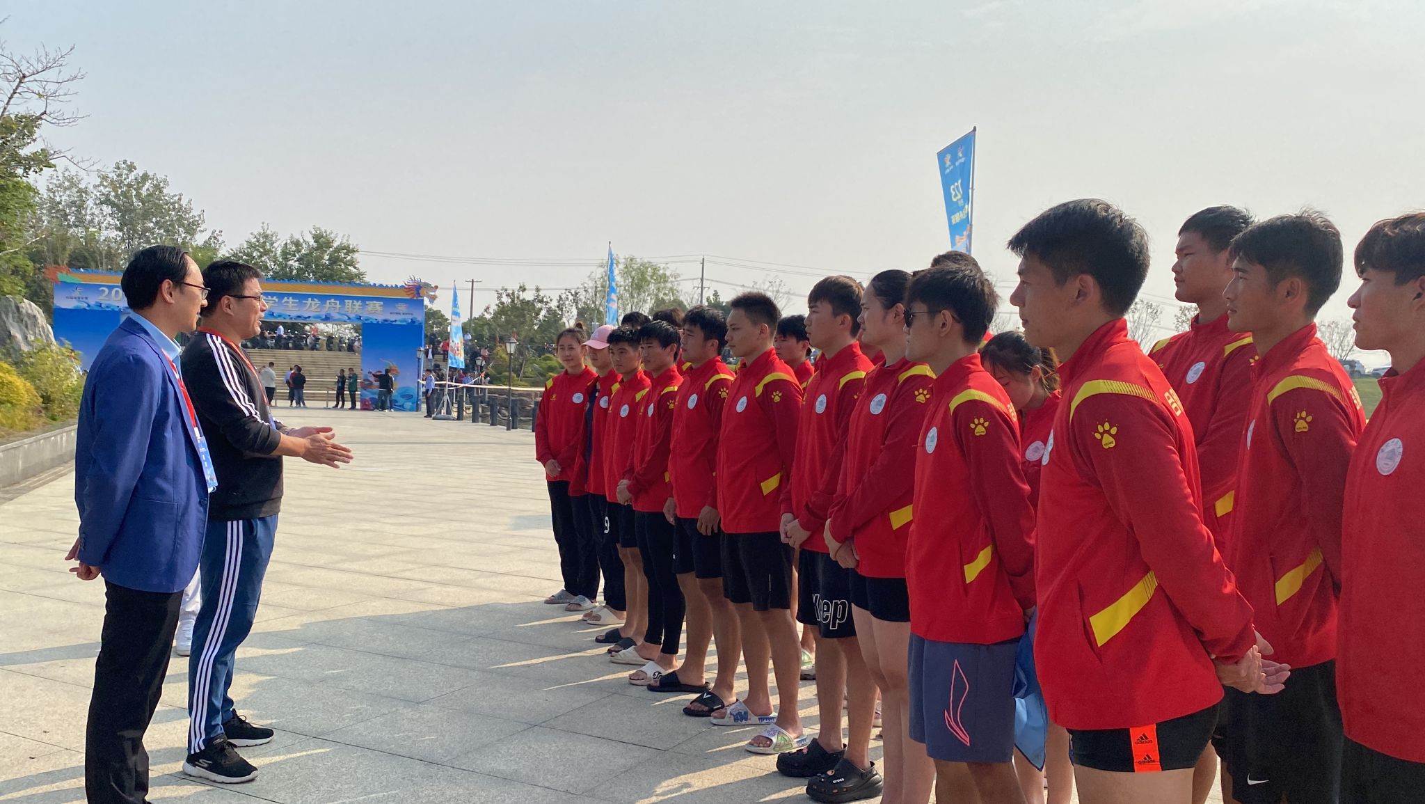 学院高度重视,精心选拔由汪辉老师担任领队,朱佳华、魏威担任教练。赛前,院党委委员、副院长周端明在体育科学学院党委书记赵波的陪同下前往赛场,看望慰问参赛的师生,希望同学们秉承“自强不息、追求卓越”的合师精神,团结协作、奋勇争先,赛出风采、赛出水平,充分展示合师学子良好的精神风貌。周端明一行现场观看了22人龙舟混合组 500 米直道竞速赛,并在开赛前参加了点睛仪式。