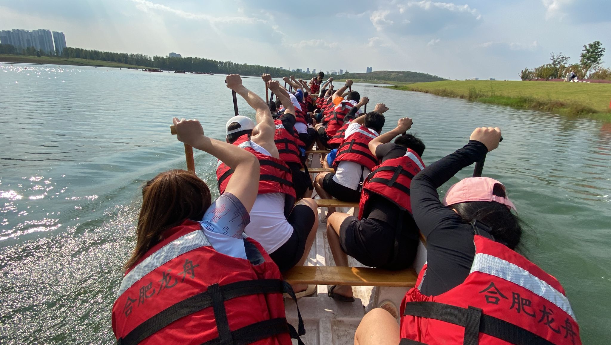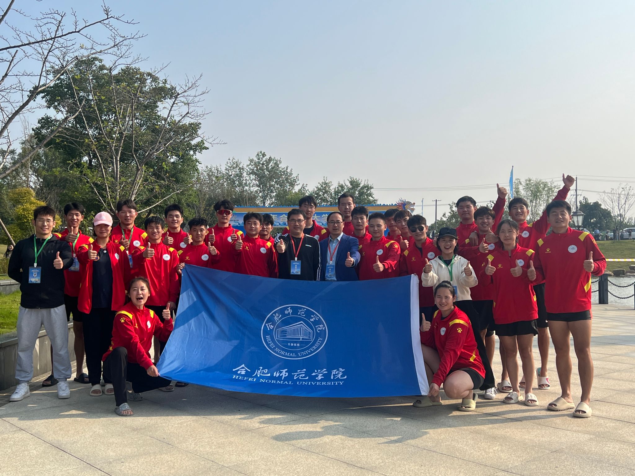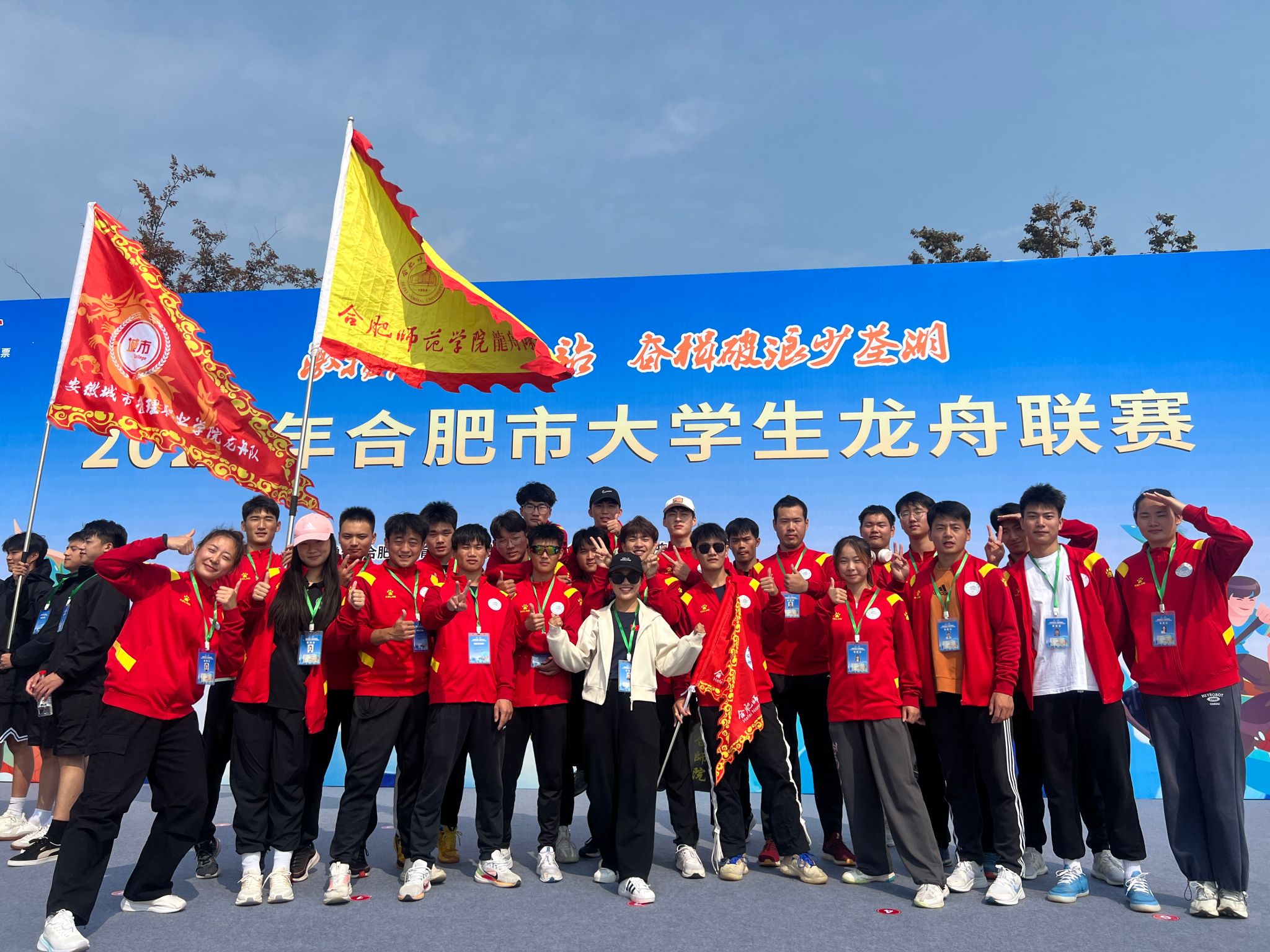 10月14日上午,由合肥市体育局、新站高新区管委会和安徽省龙舟协会联合主办,新站高新区社会发展局承办的合肥市首届大学生龙舟联赛在合肥市新站高新区少荃湖举行。赛事吸引了中国科学技术大学、安徽医科大学、安徽中医药大学等16所高校参加。最终,由2021级体能训练专业学生组成的龙舟队,克服训练磨合时间短的困难,奋勇争先、顽强拼搏、团结协作,在合肥市首届大学生龙舟联赛上收获二等奖的好成绩。