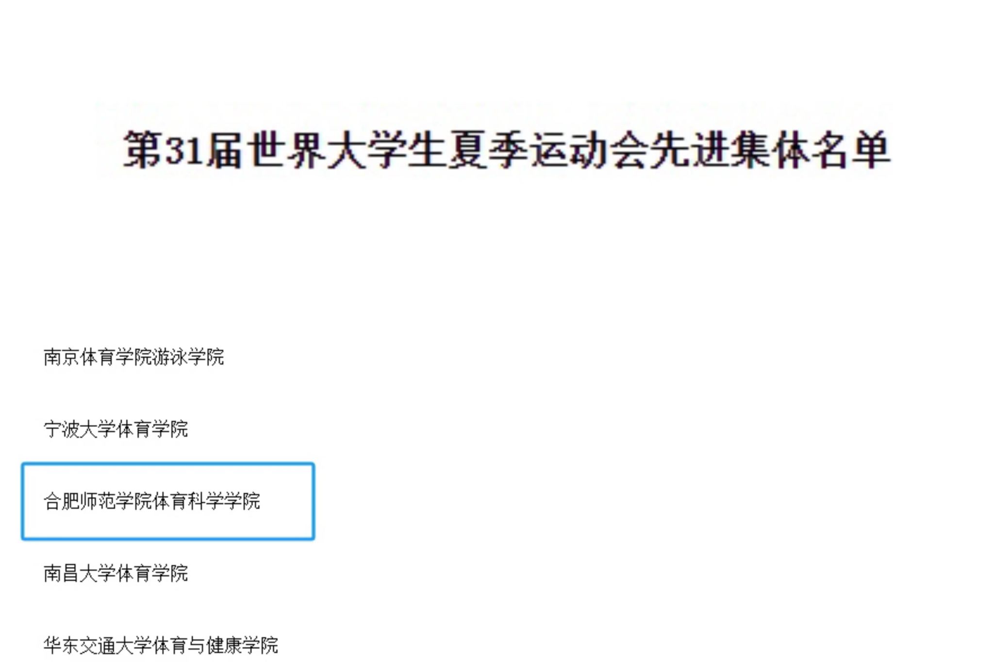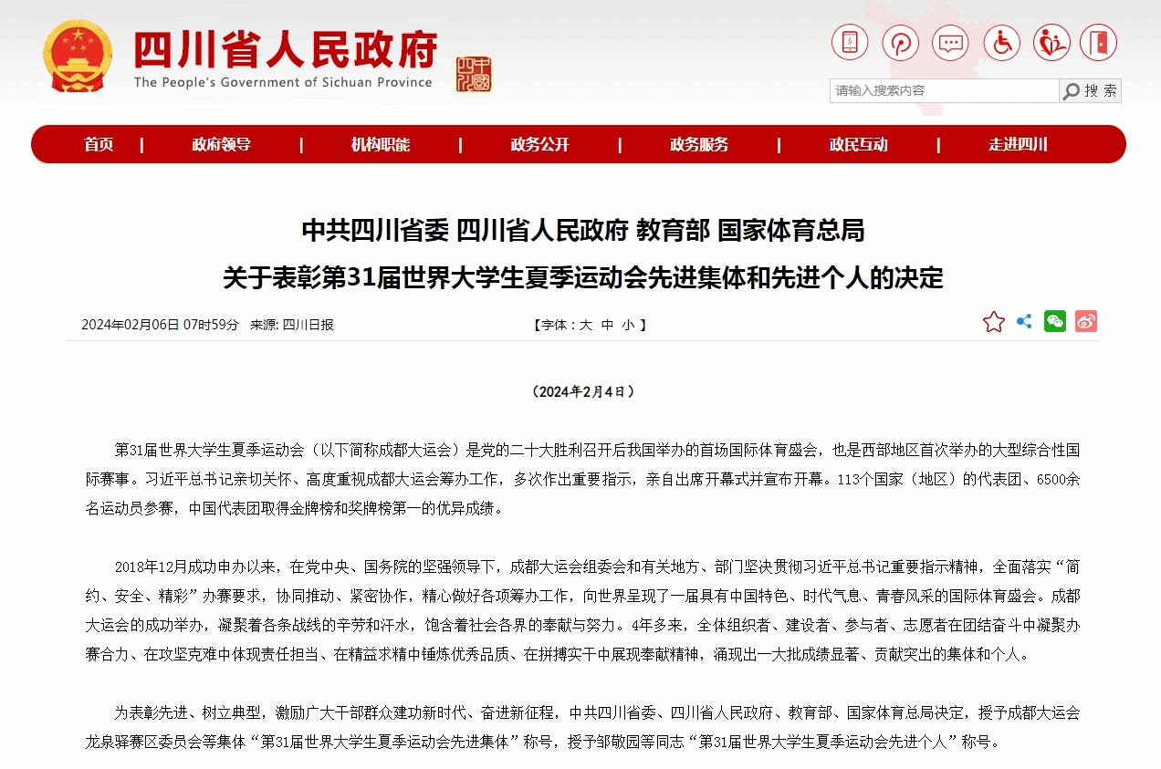 为表彰先进、树立典型,激励广大干部群众奋进新征程、建功新时代。2月4日,中共四川省委、四川省人民政府、教育部、国家体育总局联合印发《关于表彰第31届世界大学生夏季运动会先进集体和先进个人的决定》,我校体育科学学院荣获“第31届世界大学生夏季运动会先进集体”,2021级体能训练专业胡凯被授予“第31届世界大学生夏季运动会先进个人”称号。