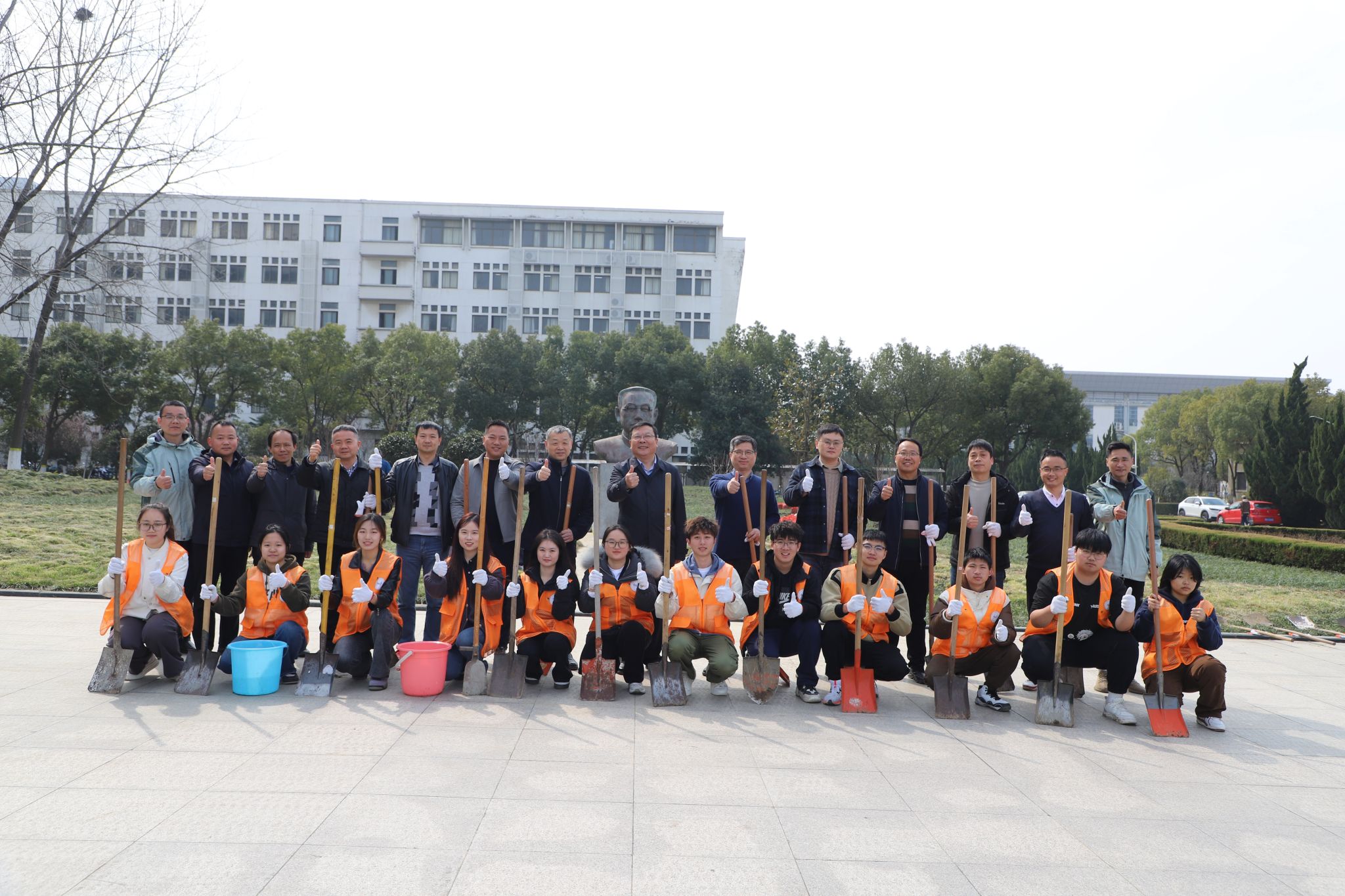 3月11日上午,在锦绣校区图书馆前行知广场,校党委书记徐成钢,党委委员、副校长华银峰,与学生志愿者们,一起挥锹铲土,携手种下桃李树。