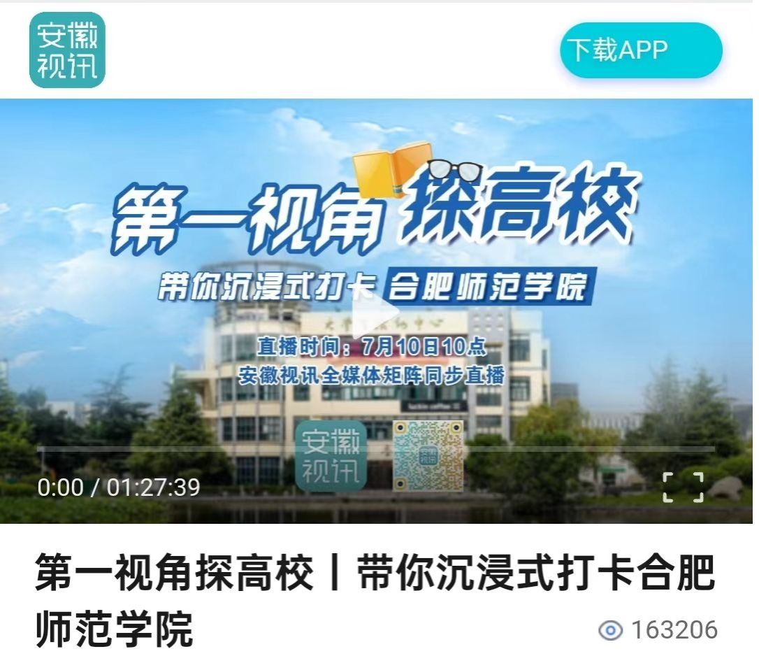 7月10日上午10点,由安徽广播电视台视讯中心主办的“第一视角探高校”直播活动第一站走进太阳成集团tyc122cc入口。此次“沉浸式打卡太阳成集团tyc122cc入口”直播活动,通过高清直播技术、创意互动环节与深度探访,让观众仿佛置身校园之中,零距离接触合师,全方位地了解合师。主播们通过网络直播的方式“云游”合师校园,对学院人才培养、招生政策、特色专业、科研平台、校园文化等进行全方位立体解读。截至发稿时,直播累计观看量近20万人次。