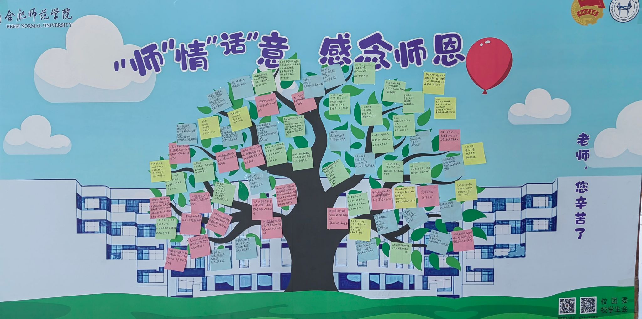 一声老师、一生老师。教师节当天,校学生会的同学们来到滨湖校区校车停放点和锦绣校区教师休息室,向亲爱的老师们献上鲜花,道一声“老师,您辛苦了”;在博学楼、行知楼等地,同学们用贺卡拼成的“祝福墙”,承载着对老师们满满的感恩之情;院团委合师青年新媒体中心刊载“铸魂育人 敬颂师恩——合师青年学子写给全体老师的一封信”,抒发对老师的心里话,感谢老师们的谆谆教诲;马克思主义学院组织思政专业同学重温感动中国的教师人物事迹;音乐学院、生物与食品工程学院、文学院的同学们与专业课老师、辅导员们拍一张暖心合影,笑脸定格了美好的师生情;教育与心理科学学院组织定向师范生观看反映“七一勋章”获得者张桂梅老师事迹的纪实电影《我本是高山》;电子信息与集成电路学院、化学与制药工程学院等组织学生收看央视《大先生——中国教育名家列传》纪录片,学习践行教育家精神。同学们积极参加“师”情“话”意祝福语(视频)征集活动,记录与老师的温暖故事,表达对老师们的感恩之情、祝福之意。