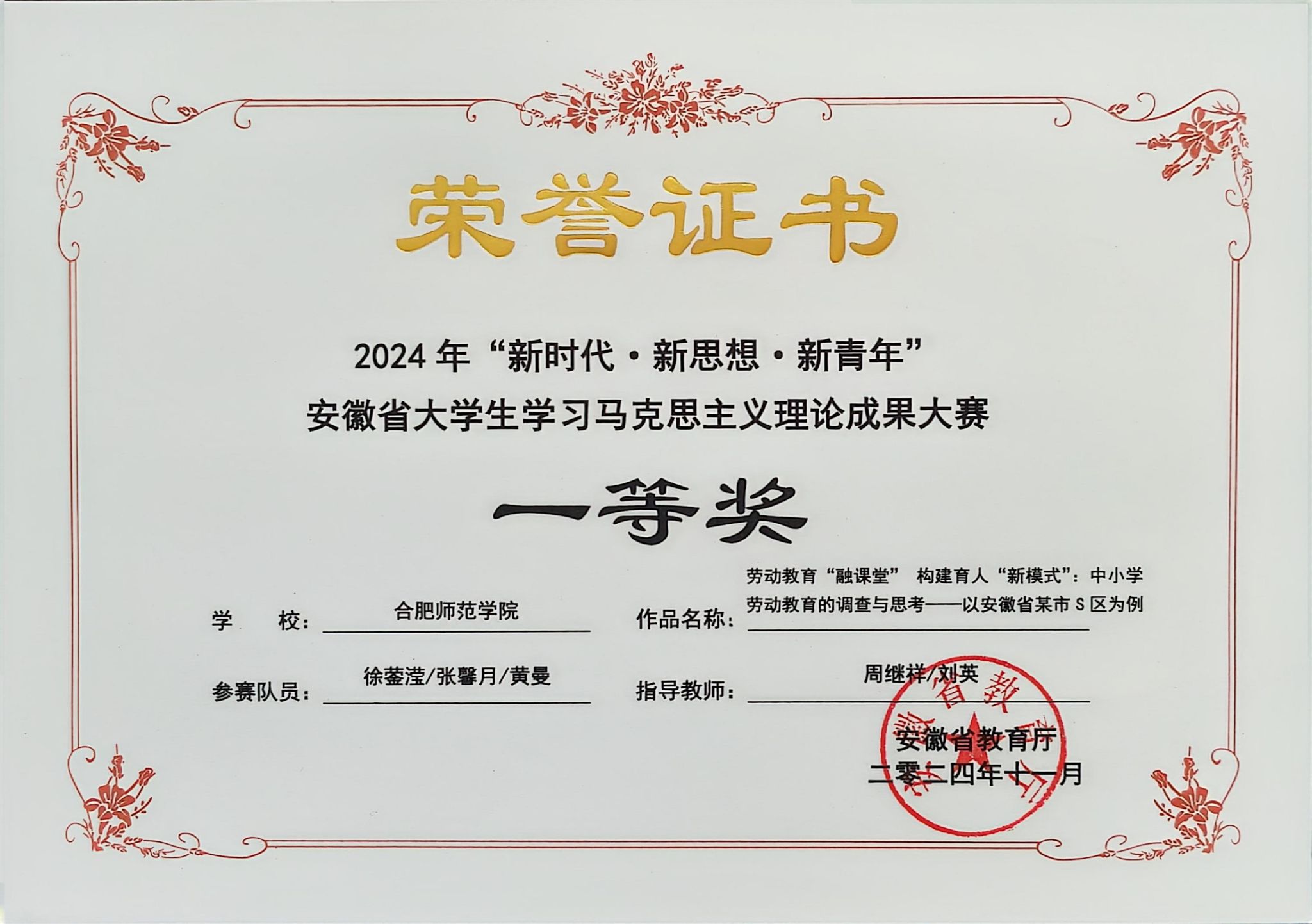 近日,2024年“新时代?新思想?新青年”安徽省大学生学习马克思主义理论成果大赛评审结果公布。我校选送的5项作品在2024年“新时代·新思想·新青年”安徽省大学生学习马克思主义理论成果大赛中3项获奖,其中一等奖1项、 三等奖2项。这是我校首次获得“新时代?新思想?新青年”安徽省大学生学习马克思主义理论成果大赛一等奖,实现了此项赛事获奖的新突破。