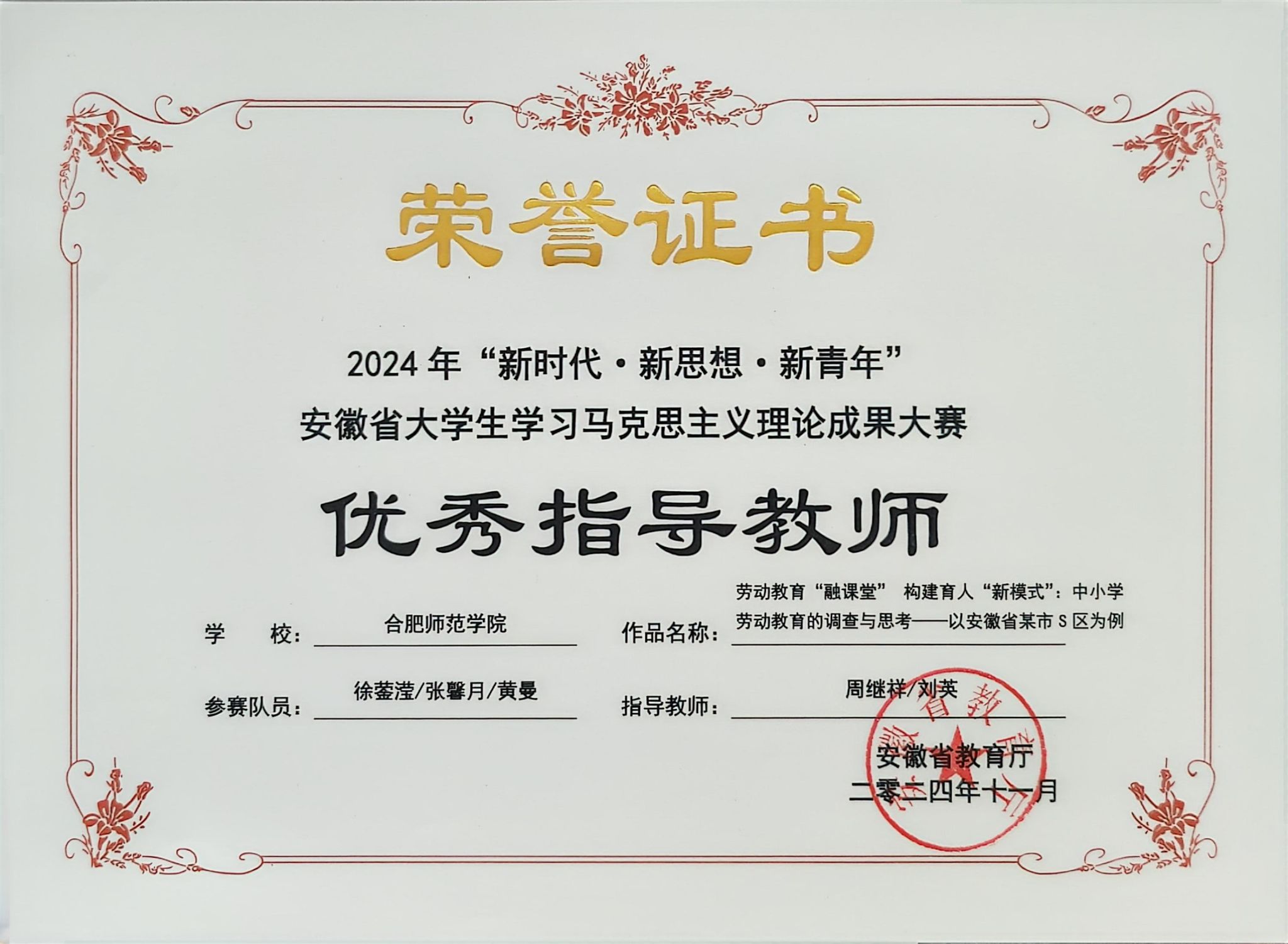 本次大赛获奖,充分彰显了合师学子的马克思主义理论素养和精神风貌,体现了学校深化教育教学改革、贯彻落实立德树人根本任务的工作成效,进一步激发了全校师生学习马克思主义理论及其最新成果的主动性和积极性。学校将进一步加强思政教育教学改革,积极构建与课堂教学相互促进的思想政治理论课第二课堂教学体系,以更加昂扬的精神风貌把党的创新理论融入思政课教学,不断提升思政课教学成效,推动高质量思政育人。(马克思主义学院:郝嘉乐)