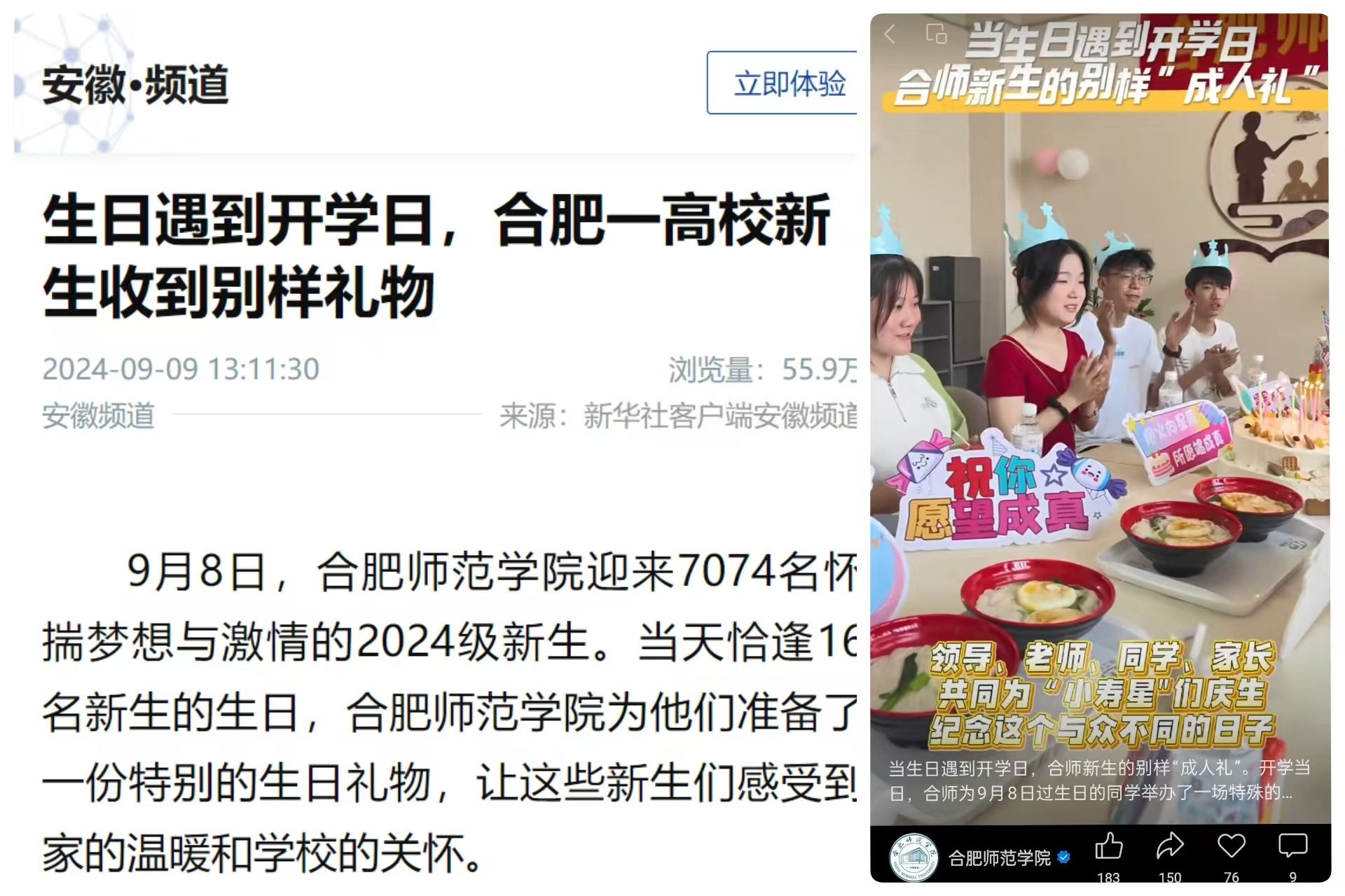 2024级新生报到日当天,恰逢 16 名新生生日。学校为此精心筹备了一场温馨的 “新生生日会”,现场为学生们分蛋糕、齐唱生日歌,并一起合影留念。新华社客户端以《生日遇到开学日,合肥一高校新生收到别样礼物》为题,对我校 “新生生日会” 活动进行了专题报道,该报道单日浏览量高达55万余次,引发了广泛关注。这是对“暖心合师”生动诠释。