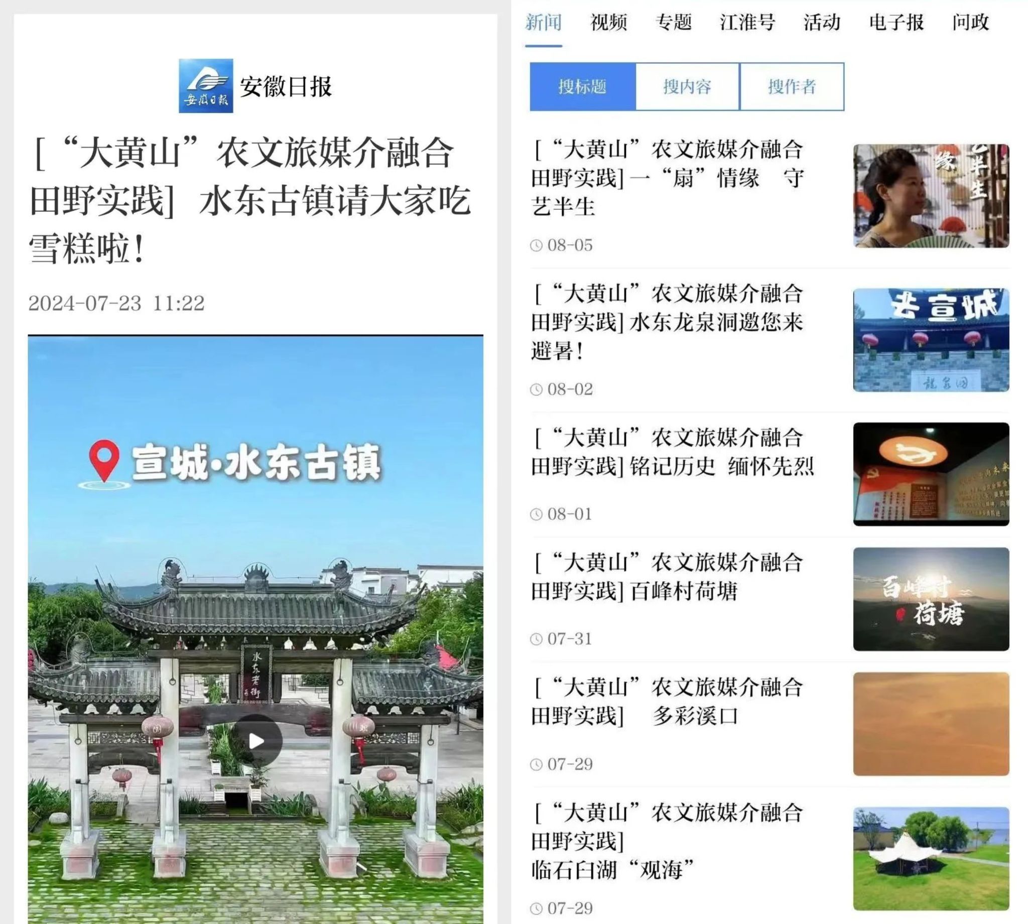 2024年暑期,文学院与《安徽日报》报业集团融媒研究院、宣州区、博望区融媒体中心联合开展“大黄山”农文旅媒介融合田野实践活动,从宣城市宣州区盘龙谷景区到水东古镇,再到宣笔、宣笔传承人……用新媒体方式全面展现徽风皖韵宜居宜业和美乡村建设成果,服务安徽文化强省战略,为“大黄山”建设增内涵添魅力。