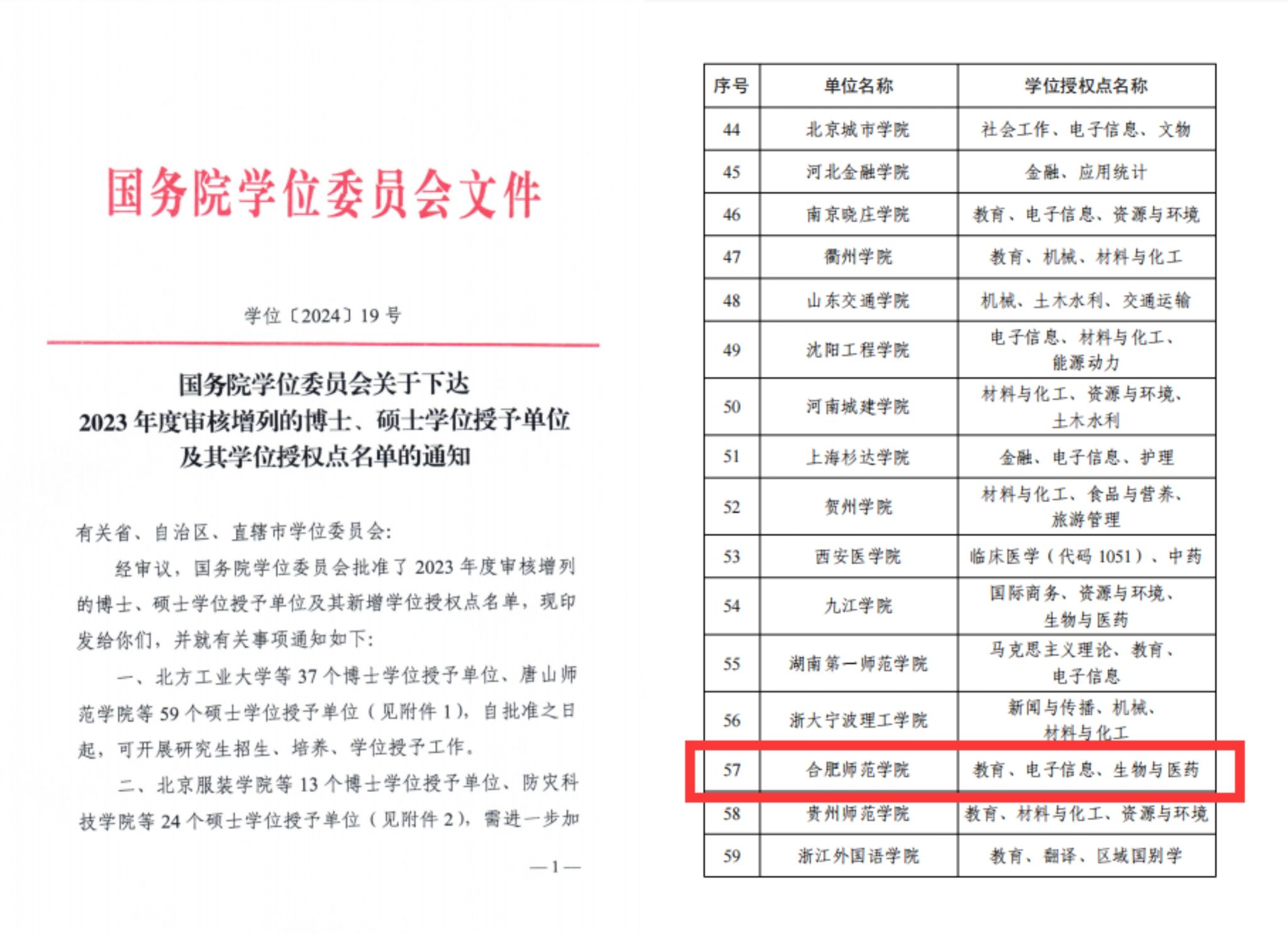 2024年9月,国务院学位委员会发布《关于下达2023年度审核增列的博士、硕士学位授予单位及其学位授权点名单的通知》,我院以全省排名第一被推荐到国务院学位委员会办公室,成功获批硕士学位授予单位以及教育、电子信息、生物与医药3个硕士学位授予点,实现了几代合师人的夙愿。这一里程碑式的成就,不仅是对过往办学成果的高度认可,更是为学院聚焦更名大学,深化应用转型,谱写高质量发展新篇章注入了强劲动力。