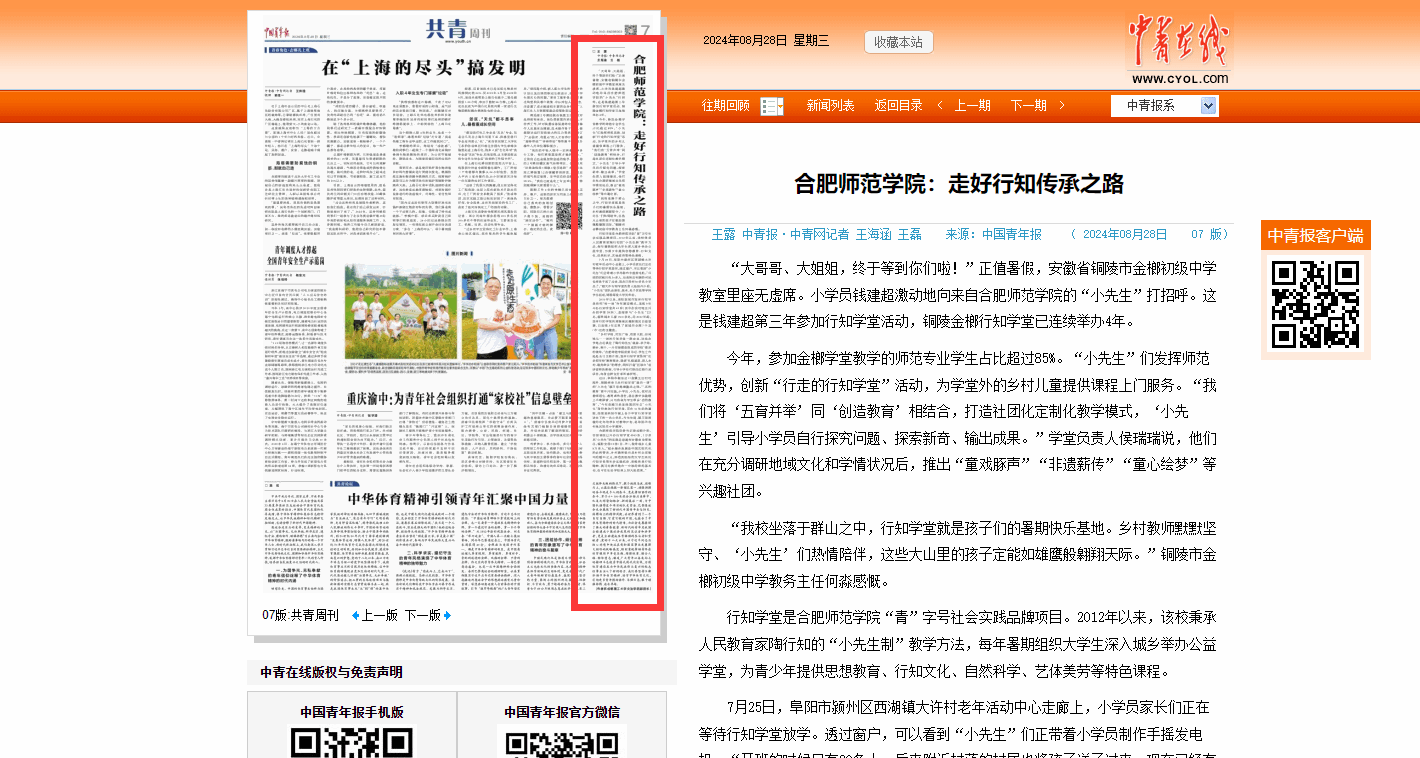 我校毕业生何淼四年来与母校共建行知学堂事迹得到《安徽日报》等多家媒体报道