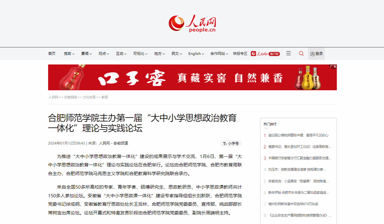 第一届“大中小学思想政治教育一体化”理论与实践论坛被人民网等媒体报道
