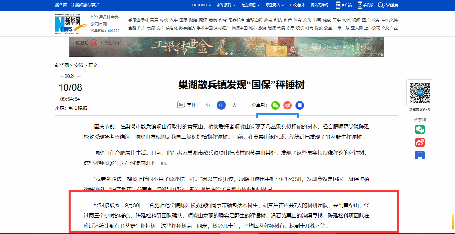 陈延松科研团队在芜湖无为市境内发现我国特有的珍贵树种被新华网等媒体报道