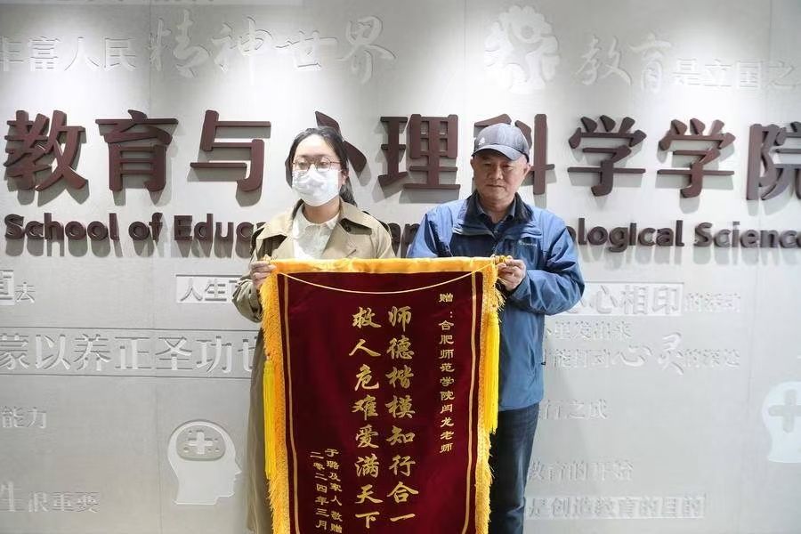 2024年3月20日早上,2021级学生于璐在校外骑车前往实习地点途中,突遇事故陷入昏迷。教育与心理科学学院闫龙老师上班恰巧路过,通过紧急组织施救,最终学生转危为安。3月29日,于璐亲手将一面书有“师德楷模知行合一, 救人危难爱满天下”的锦旗送给了闫龙老师,感谢他在自己昏迷时伸出的“援助之手”。闫老师见义勇为、言传身教,彰显了教师关爱学生的高尚师德本色,为广大师生树立了榜样。
