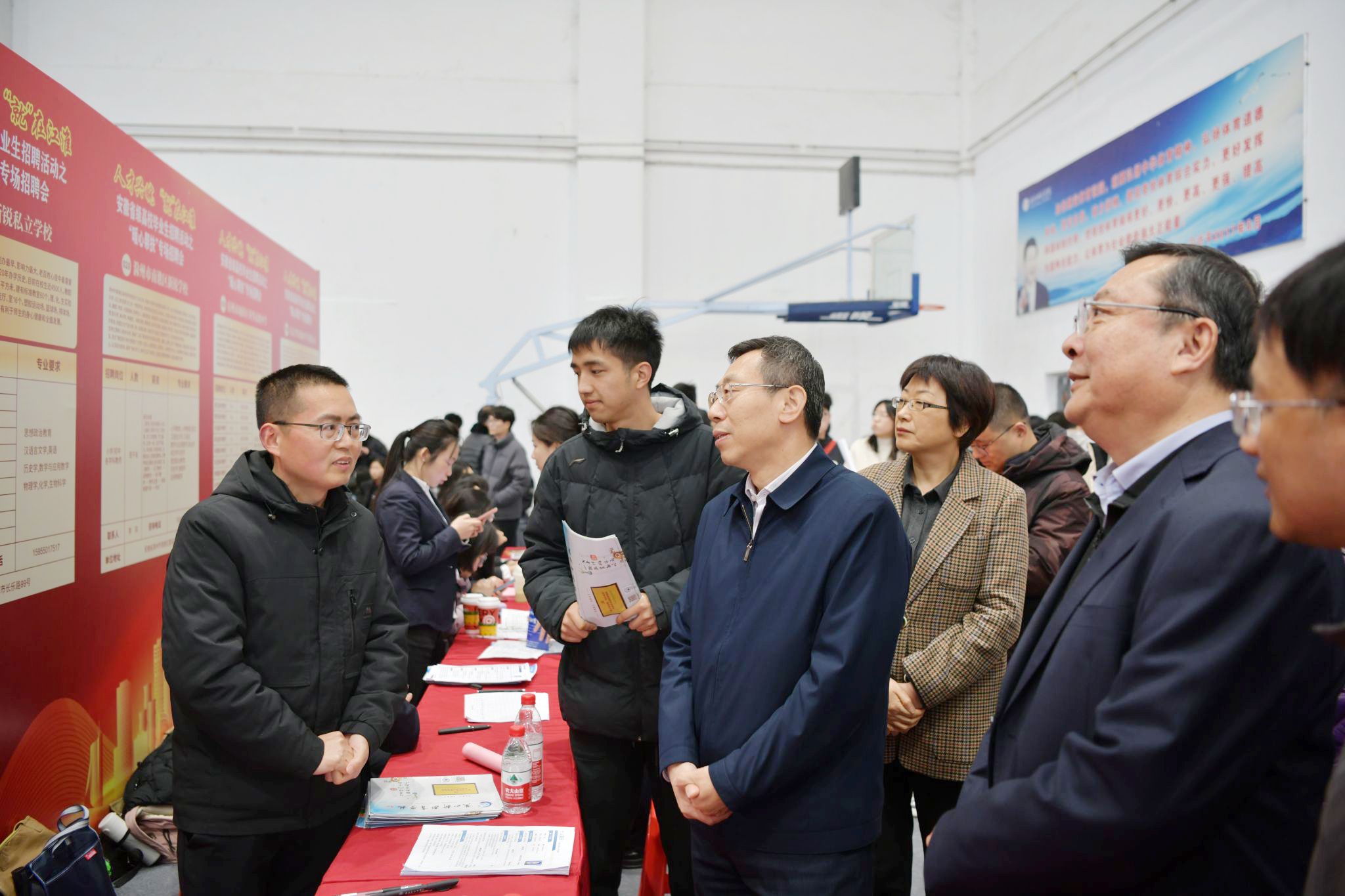 为深入学习贯彻习近平总书记关于做好高校毕业生就业工作的重要指示批示精神,落实省委、省政府人才兴皖的战略部署,为全省各类用人单位和高校毕业生搭建对接招聘平台,用心用情做好脱贫家庭、低保家庭、零就业家庭和残疾高校毕业生等重点群体就业工作,促进高校重点群体毕业生高质量充分就业,3月14日下午,由省教育厅、省人力资源和社会保障厅、国家开发银行安徽省分行联合举办,太阳成集团tyc122cc入口承办的“人才兴皖“就”在江淮”省级高校毕业生系列招聘活动之“暖心帮扶”专场招聘会在锦绣校区体育馆举行。安徽省委教育工委副书记范奇、国家开发银行安徽省分行党委委员、副行长钟鸣、安徽省教育厅高校学生处、大中专毕业生就业指导中心、学生资助管理中心、安徽省人力资源和社会保障厅就业促进和失业保险处相关负责同志,在院党委书记徐成钢,党委副书记、院长方东玲的陪同下来到招聘会现场。