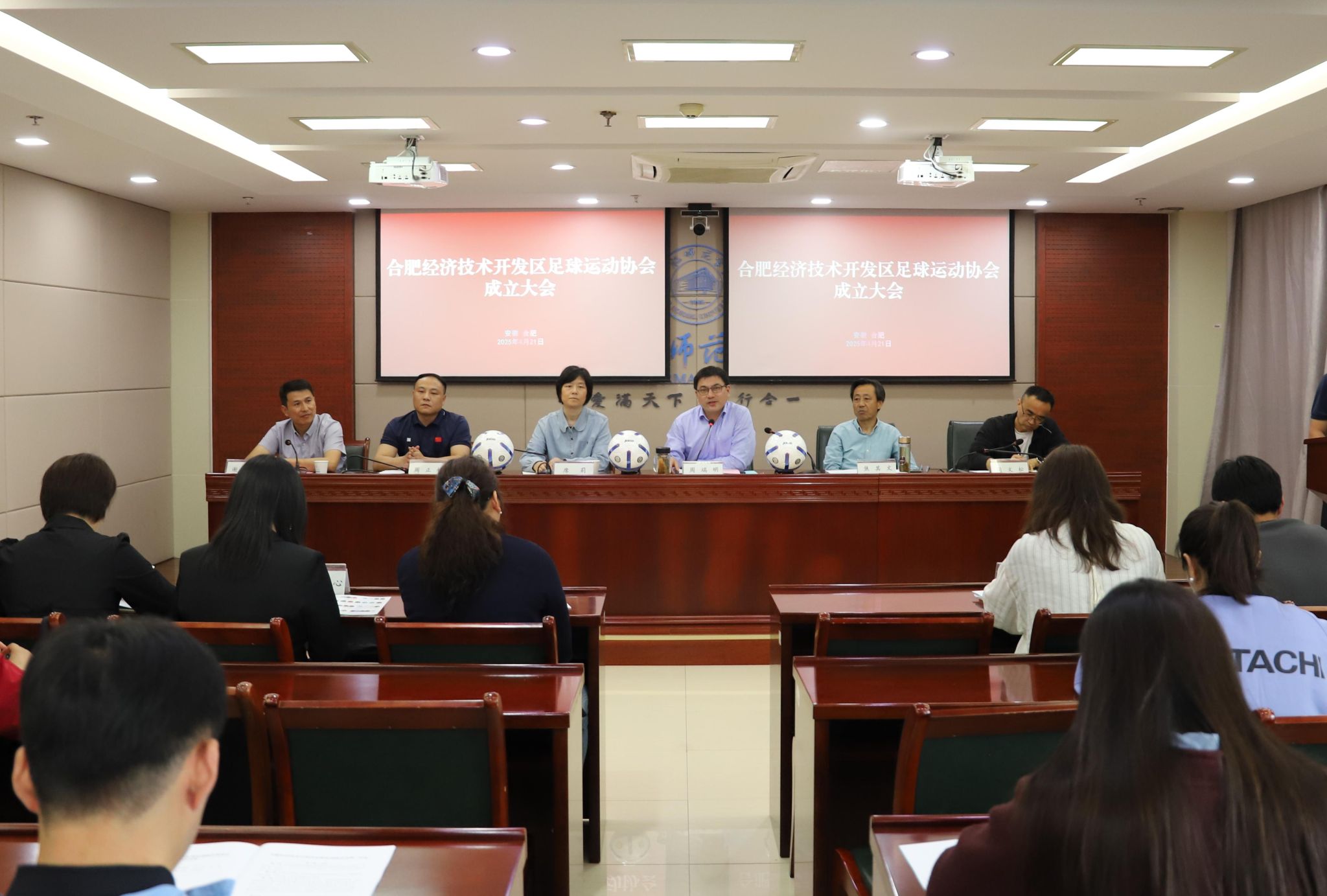 4月21日下午,合肥经开区足球协会成立大会暨第一届会员代表大会在学院锦绣校区顺利召开。院党委委员、副院长周端明,合肥市足球运动协会主席焦其文,体育科学学院副院长席莉,合肥经开区社发局体艺处周正林、郑倩,合肥经开区体育总会主席周文松、秘书长丁俊等出席会议,各(街道)社区相关工作负责人,安徽大众、蔚来汽车、联宝电子、日立建机多家区内企业代表以及协会全体会员等近百人参会。