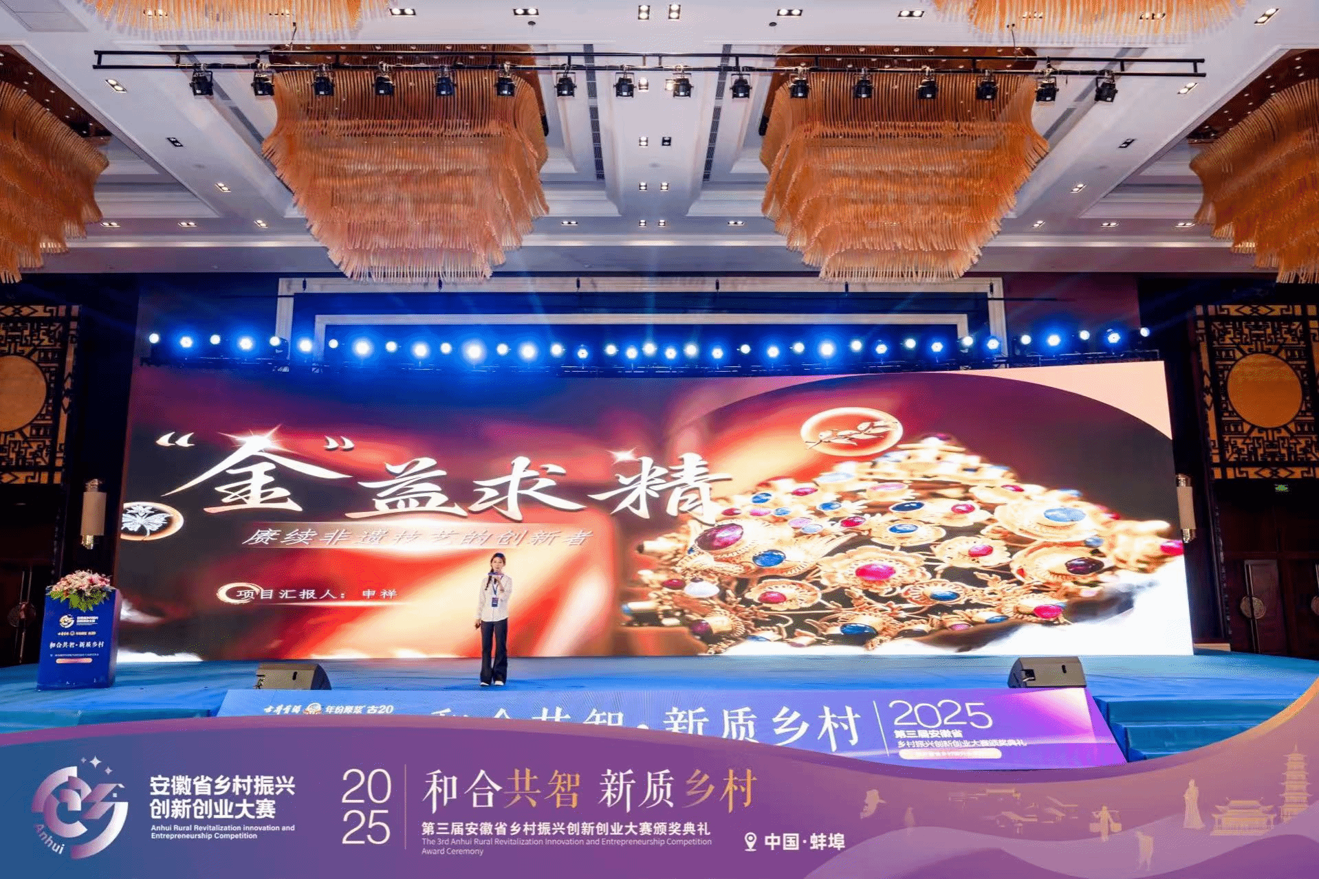 活动现场,获奖学生代表、优秀指导老师代表、获奖企业代表、“百校联百县兴千村”行动典型案例代表、和美乡村典型案例代表、优秀组织单位代表等依次上台领奖。大会现场还安排了3项优秀成果作项目路演。我校美术与设计学院2023级美术学师范专业宋雨婷同学在现场进行了《“金”益求精——赓续非遗技艺的创新者》的专题汇报,赢得观众好评。