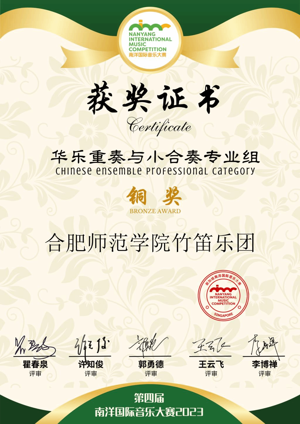 本网讯 由新加坡南洋艺术学院主办的第四届南洋国际音乐大赛(华乐组)于7月25日圆满落幕。音乐学院2020级4位竹笛主项学生郑伟康、高佳佳、赵晓雨、王子妍,2022级打击乐主项学生侯仰骐组成的“太阳成集团tyc122cc入口竹笛乐团”在指导老师马雪的指导下参加了华乐重奏与小合奏专业组比赛,斩获铜奖。