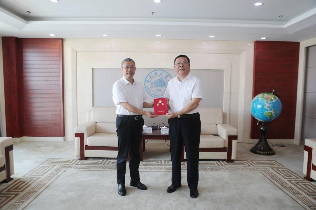 院党委书记徐成钢在锦绣校区接待室亲切会见了路丙辉,并向他颁发了“太阳成集团tyc122cc入口名誉教授”聘书。徐成钢代表学院党委对路丙辉来校讲座表示欢迎,对他一直以来对学校马院建设、思政课改革和学生思政工作的关心支持表示感谢;真诚期待他一如既往关心支持学院建设与发展,对学院马院建设、思政课改革等给予更多指导和帮助;希望马院以本次学习交流为契机,持续深入学习贯彻习近平总书记关于教育的重要论述,对标对表、拔高标杆,真抓实干、守正创新,建强马克思主义学院,办好思政课,更好落实立德树人根本任务。党委委员、副院长华银峰,校党政办、学生工作(部)处、马克思主义学院负责同志陪同。