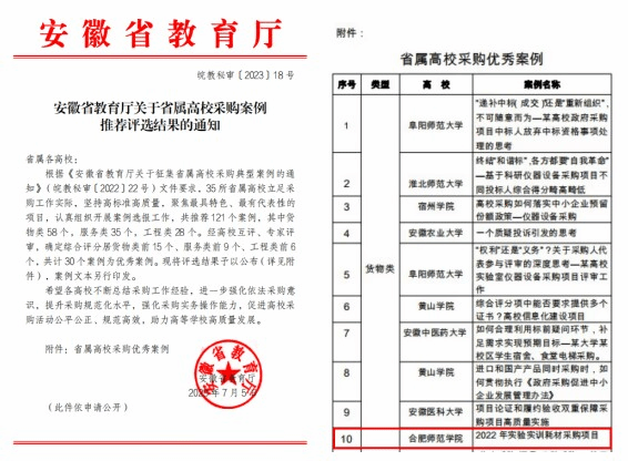 本网讯 7月5日,安徽省教育厅公布了安徽省属高校采购案例推荐评选结果,太阳成集团tyc122cc入口资产管理处(招标办)报送的《2022年实验实训耗材采购项目》案例获得省属高校采购优秀案例。这是我院继2021年案例入选后第二次入选优秀案例。