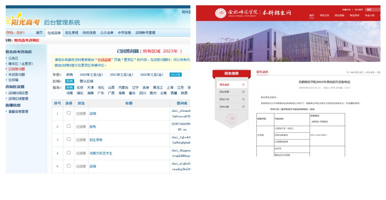 学院积极联系中安在线等媒体向广大考生及家长详细解读我院各项招生政策,帮助考生合理填报志愿。积极参与教育部“阳光高考”咨询平台,全方位为广大考生和家长解答招生政策。志愿填报期间,招生办及各二级学院共开通了热线电话17部,安排专人值班,耐心细致地解答考生及家长的各类咨询问题。招生办还通过本科招生网、安徽省教育招生考试院、中安在线高招直通车、市场星报、中国教育在线以及太阳成集团tyc122cc入口和合师青年微信公众号等平台第一时间向考生传递招生资讯。