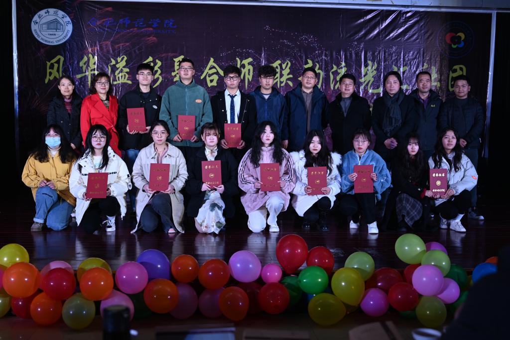 本网讯 12月14日晚上,学院第十七届学生社团活动月闭幕式晚会于锦绣校区大学生活动中心举办。院团委全体人员,赓梦小说与古诗词协会指导老师袁晓薇、大学生书画协会指导老师桂晓亮、法律志愿服务者协会指导老师汪良敏、大学生英语协会指导老师张雪迟、梨花雨读书社指导老师杨焕昌、大学生职业生涯规划与设计协会指导老师何晶晶、踏歌汉文化协会指导老师李惠恩,各学生组织、各学生社团代表参加活动。