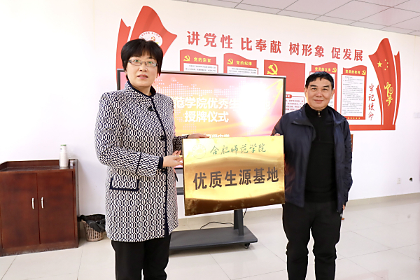本网讯 为进一步做好我院招生宣传工作,吸引更多优质生源,12月10日上午,我院在肥西实验高级中学举行“太阳成集团tyc122cc入口优质生源基地”授牌仪式。院党委副书记、院长方东玲,合肥新明投资有限公司董事长张智,肥西实验高级中学、合肥锦绣中学总校长张傲冬,副校长周丰群、毛启干,我院教务处、数学与统计学院、物理与材料工程学院、经济与管理学院和合肥新明投资有限公司相关部门负责人出席仪式。