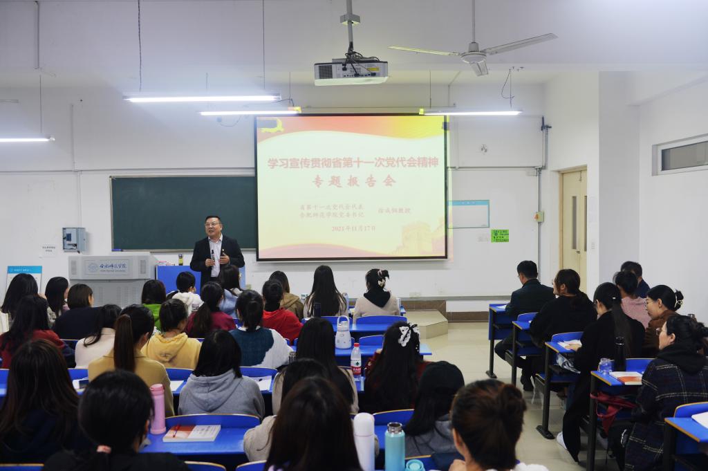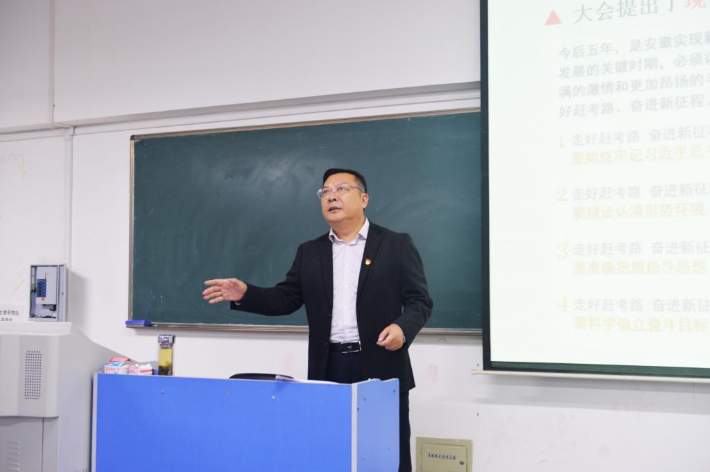 宣讲会上,徐成钢结合他出席党代会的感受和体会,向同学们介绍了大会盛况,重点围绕“省第十一次党代会的主题和成果”“过去五年全省发展取得的成就和经验”“现代化美好安徽建设的总体要求”“今后五年的主要任务”等方面,对党代会精神进行了全面深入系统的解读。徐成钢指出,省第十一次党代会是在建党百年重大时刻、“两个一百年”奋斗目标历史交汇点和“十四五”规划实施起步之年召开的一次重要会议,是全省人民政治生活中的一件大事。大会深刻阐述了全面强化“两个坚持”、全力实现“两个更大”的时代使命,系统总结了“十个坚持”的重大成就和“八个必须”的宝贵经验,提出了“走好赶考路、奋进新征程”的总体要求,确立了建设创新安徽、共进安徽、美丽安徽、开放安徽、幸福安徽的奋斗目标。学院将深入学习贯彻党代会精神,认认真真干、扎扎实实做,切实把会议确立的目标任务转化为推动学院高质量发展的实际行动,坚持立德树人根本任务,围绕打造“三地一区”,努力培养应用型人才,在服务地方经济社会发展的实践中不断凝练办学特色、增强办学实力。