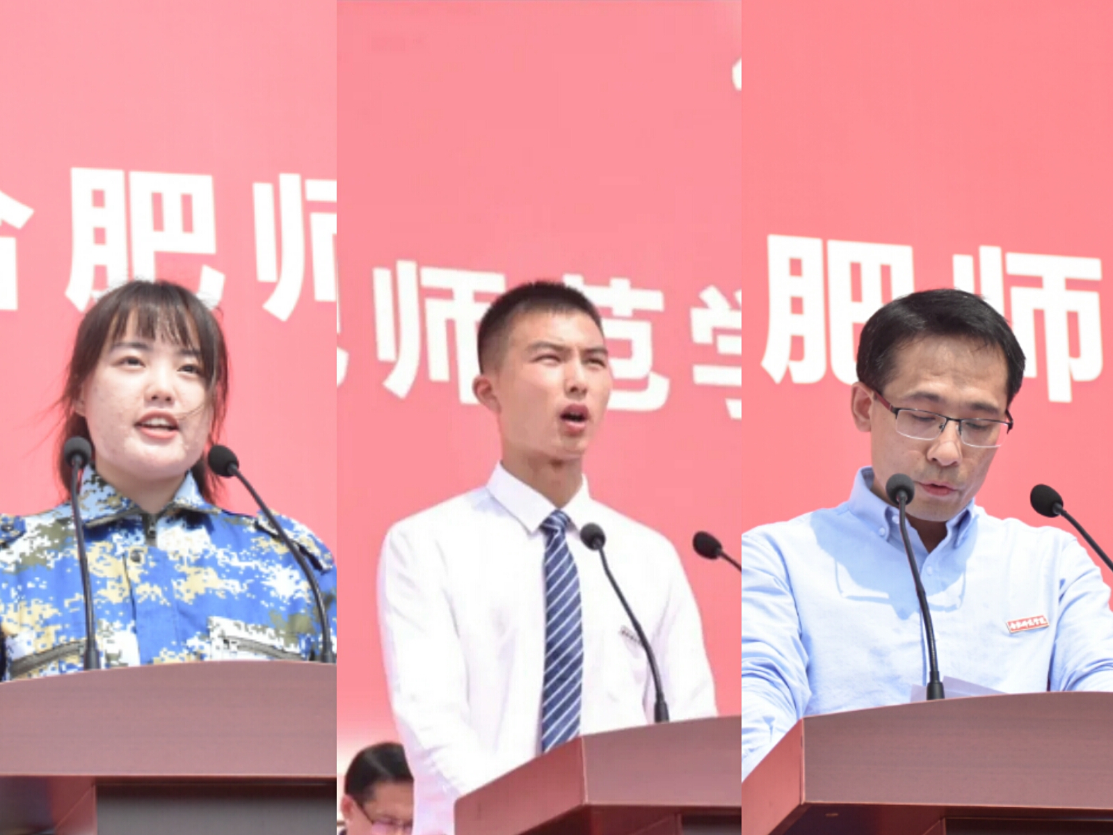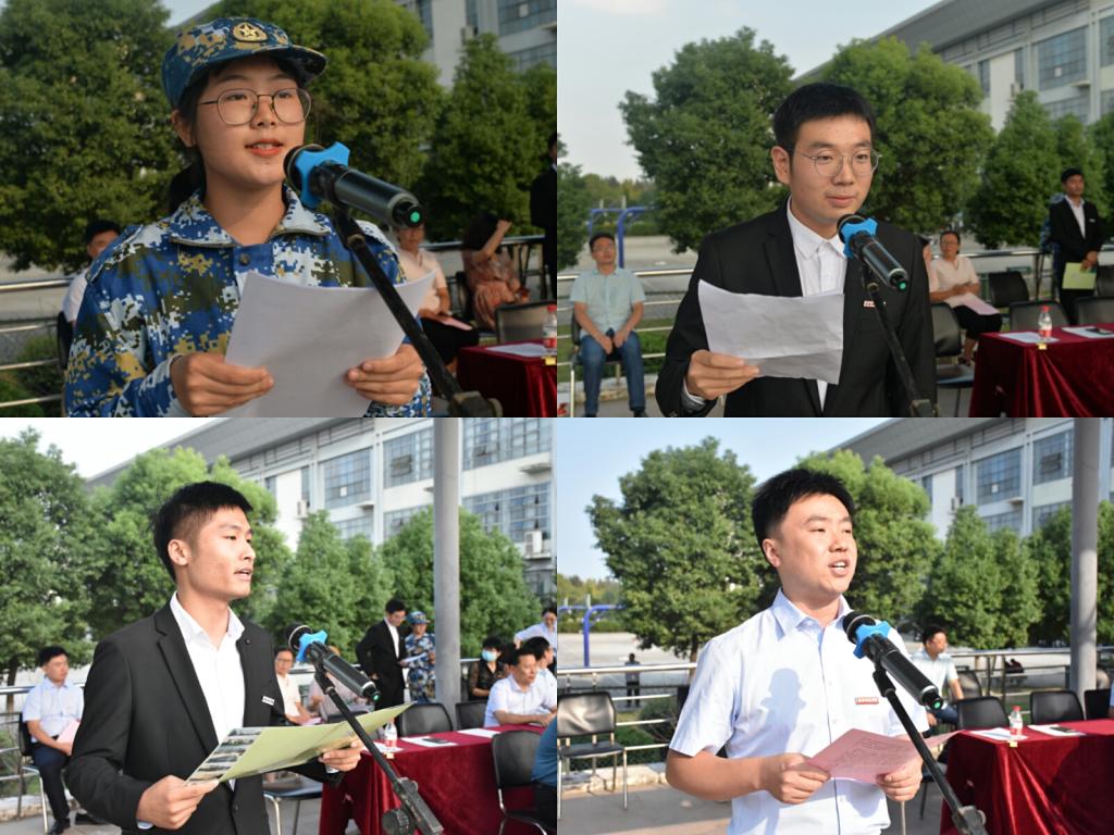 滨湖校区经济与管理学院赵程程同学、数学与统计学院黄帅同学、电子信息与电气工程学院范程华教授分别作为新老生代表和教师代表发言,锦绣校区马克思主义学院甘锦同学、文学院研究生史义鑫同学、化学与化学工程学院杨辰同学、数学与统计学院黄浩副教授分别作为新老生代表和教师代表发言。
