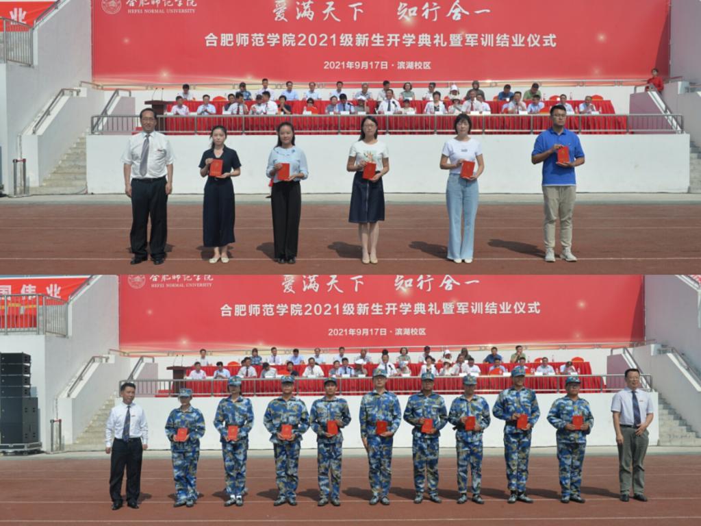 汇报表演结束后,党委副书记吴昕春宣读《表彰2021级新生军训优秀学员、优秀辅导员和优秀教官的决定》;副院长谢阳群、姚本先、曹卓良、院纪委书记徐文林分别为优秀军训教官、优秀辅导员和优秀军训学员颁发荣誉证书。