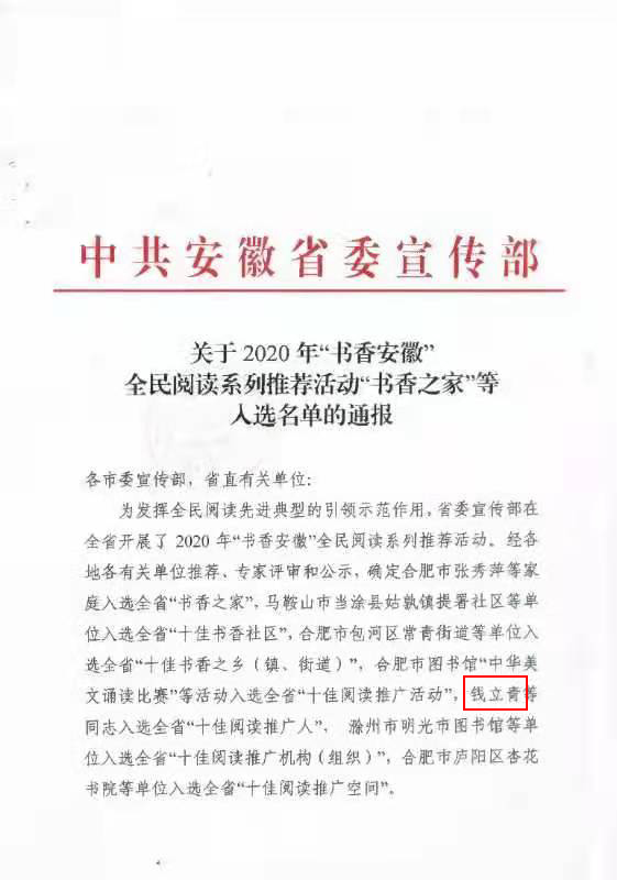 本网讯 近日,中共安徽省委宣传部印发《关于2020年“书香安徽”全民阅读系列推荐活动“书香之家”等入选名单的通报》,我校机关第二党委书记钱立青入选全省“十佳阅读推广人”。
