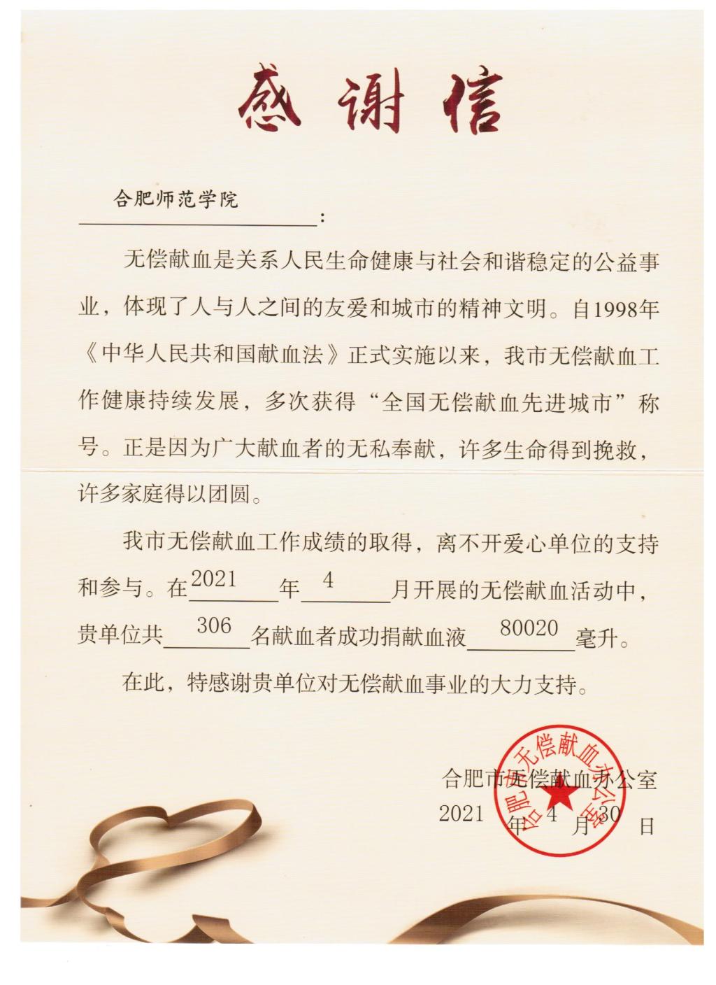学院一直高度重视无偿献血工作,五年来参与献血人数4000余人,累计献血量80余万毫升。广大合师青年学子无私奉献、热情参与,用实际行动弘扬了社会主义核心价值观,充分展示了合师青年积极承担社会责任的良好形象,为我国无偿献血事业作出了积极贡献。(青年志愿者联合会:丁浩天 王懿凌/文 朱敏慧 朱文静 潘绍文 郑欣琪 张思帆/图)