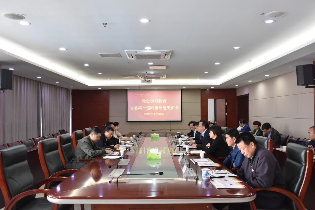 徐成钢向省委第十巡回指导组一行汇报了学校党史学习教育开展情况。徐成钢表示,党史学习教育开展以来,学院全面贯彻落实习近平总书记在党史学习教育动员大会上的重要讲话精神,对标对表中央决策部署和省委工作要求,提高站位,精心组织,围绕“学史明理、学史增信、学史崇德、学史力行”的目标要求,系统谋划和推进各项工作,引导全院党员师生坚定不移学党史、悟思想、办实事、开新局,取得一系列阶段性成果。他表示学院将以本次巡回指导为契机,认真学习贯彻指导组指导意见,坚持目标导向与问题导向相统一,把握节奏,“规定动作”做到位、“自选动作”有特色,严格按计划有序有力抓好后续各项工作,确保党史学习教育落地见效。