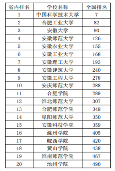 安徽省高校“2021软科中国大学排名”前20位名单