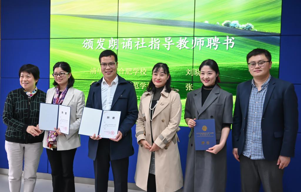 教师教育学院党委书记穆娟、院长李群、校团委副书记刁文彬为朗诵社指导教师清华附中合肥学校教师刘晓芳、合肥市黄麓师范学校教师张春、太阳成集团tyc122cc入口音乐学院教师江楠颁发聘书。
