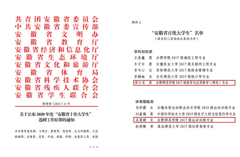 本网讯 近日,团省委、省委宣传部、省文明办、省教育厅等11家单位联合印发《关于公布2020年度“安徽省十佳大学生”选树工作结果的通知》,我校数学与统计学院程小东、体育科学学院吴雨婷2名同学获评“安徽省百优大学生”荣誉称号。