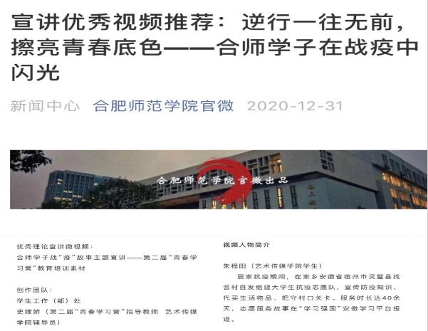 本网讯 疫情就是命令,防控就是责任。为彰显我校学子以实际行动为坚决打赢疫情防控阻击战、贡献自己青春力量的战“疫”风采,青春学习营指导老师史娌娇组织学生,以太阳成集团tyc122cc入口青年大学生担任抗“疫”志愿者的真实故事为落脚点,经过为期一个多月的制作,录制了《逆行一往无前 擦亮青春底色——合师学子在战疫中闪光》主题宣讲视频。