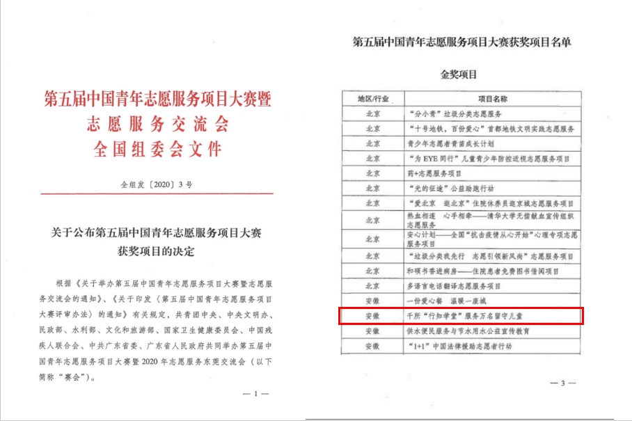 本网讯 日前,第五届中国青年志愿服务项目大赛全国总决赛落下帷幕。我校《千所“行知学堂”服务万名留守儿童》项目荣获全国金奖(安徽省仅4项,全省高校仅1项),实现了学校各类“国字号”赛事金奖零的突破。