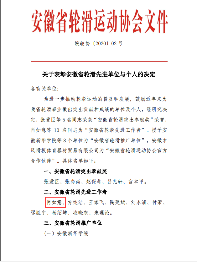 会议还对近年来为我省轮滑事业作出突出贡献和成绩的单位及个人进行了表彰,我院肖如意老师获评安徽省轮滑先进工作者,学院获评安徽省轮滑推广单位。