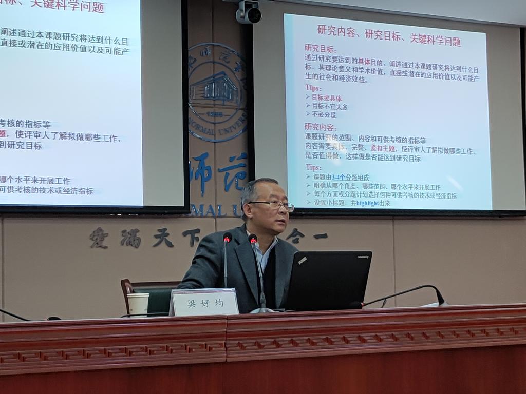 辅导报告会上,梁好均教授从国家自然基金项目申报书的选题、课题名称设计、立项依据撰写、可行性分析等常见的问题谈起,结合自身多年申报、承担国家基金项目的经历和经验,重点讲解了国家基金项目申报材料的撰写要点、注意事项和容易出现的问题等。