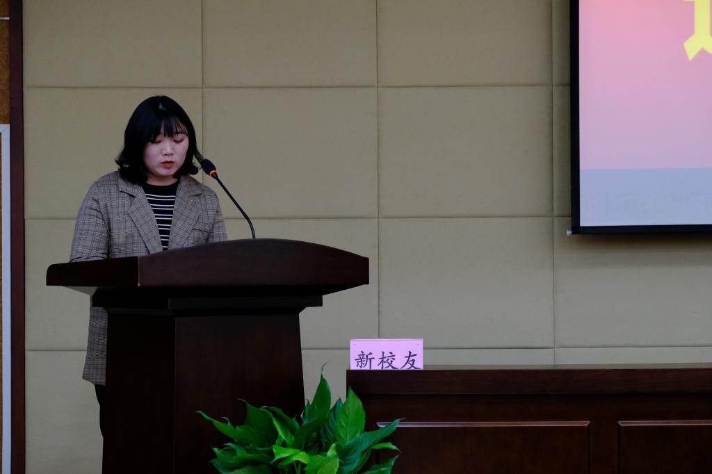 何雨晴代表2020届赴沪新校友发言,感谢母校领导在他们走出校门后依然非常关心他们,感谢母校校友会为他们所做的工作,感谢上海校友会和学长们的接纳、帮助与指导;表示将不负众望,好好学习,努力工作,为母校增光,为上海校友会作贡献。