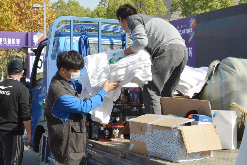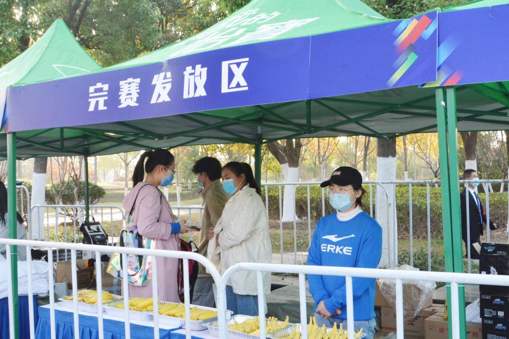 志愿者在完赛发放区等待发放物资