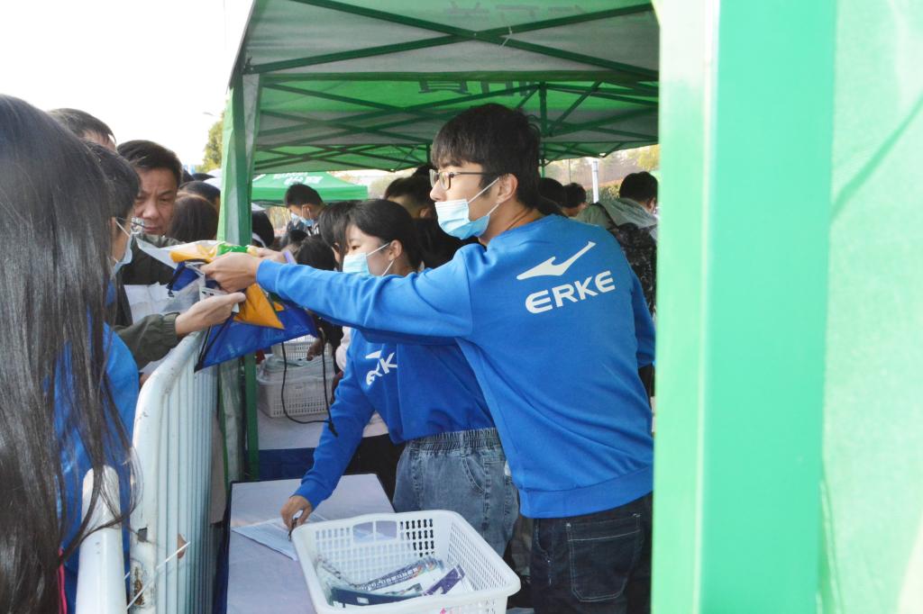 “我们手持的体温枪是保障赛场安全的重要工具,我丝毫不敢马虎。”化学与化学工程学院2020级化学(师范)专业孙英杰同学整齐佩戴口罩,手持体温枪为每一名检录比赛者提供体温测量服务。“我的工作内容是赛事包分拣发放,就是选手陆续到场后,需让选手们有序排队,依次领取本人赛服,领到服装后,我们会指引选手前往检录处进行检录,为比赛做准备。”赛事包发放处的接待区域内,生命科学学院生物技术2020级应玉俊同学正麻利的整理着依据不同参赛者身份分拣的赛事包。 “以前就想参加马拉松的,但是怕自己跑不下去。今天看到许多老爷爷老奶奶和小朋友也参与了,这对我是很大的鼓舞,觉得以后有机会可以尝试一下。”在比赛开始前,化学与化学工程学院2019级化学(师范)专业米热古丽·巴日同学与情绪紧张的参赛者聊了起来,提供心理建设服务的同时,自己也受到了启发。