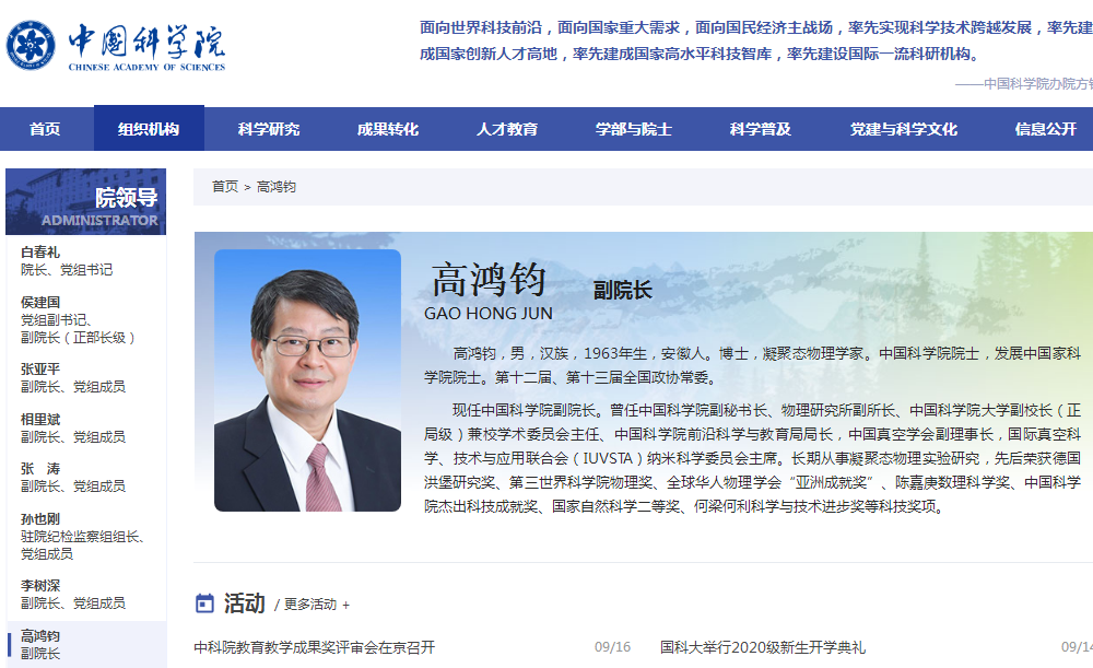 本网讯 近日,中国科学院网站“院领导”栏目更新,显示我院87届物理专业校友高鸿钧院士已担任中国科学院副院长。此前,他曾担任中国科学院副秘书长等职。
