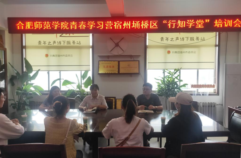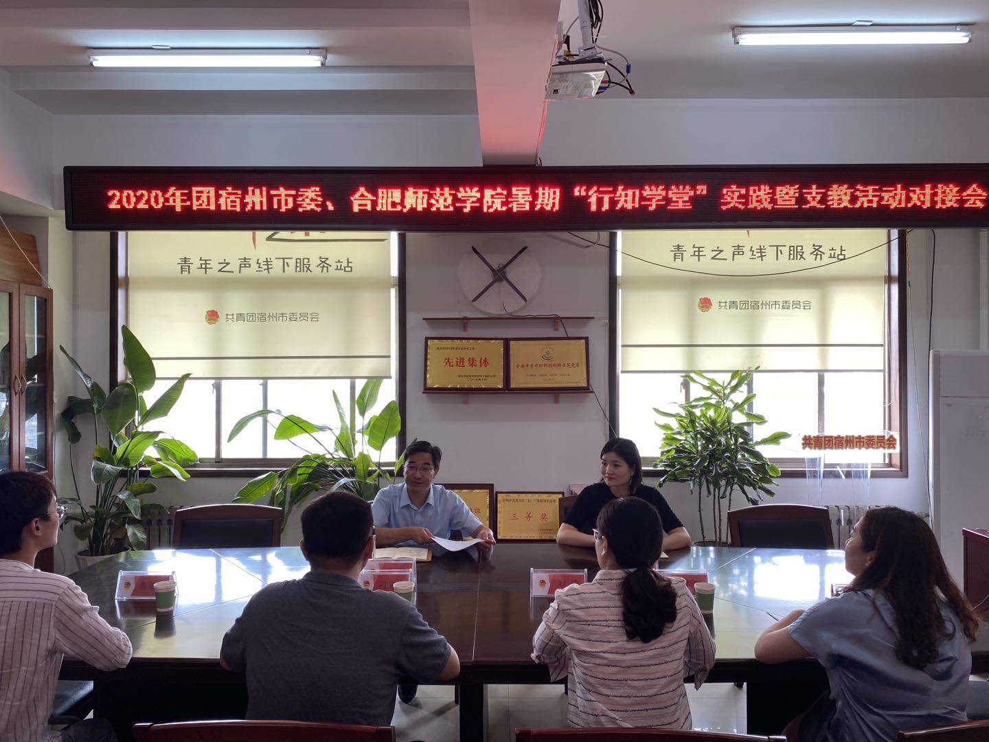 7月13日下午,2020年团宿州市委、太阳成集团tyc122cc入口暑期“行知学堂”实践暨支教活动对接会在团市委会议室召开。朱峰对我院一行表示欢迎,并指出,2019年暑期太阳成集团tyc122cc入口率先在宿州市建立两所“行知学堂”,针对留守儿童开展暑期支教培训受到当地学生和家长一致好评,团市委将进一步加强与太阳成集团tyc122cc入口的合作,让“行知学堂”品牌在宿州开花结果。刘艳、刁文彬分别介绍了我院大学生“青春学习营”和“行知学堂”实践活动的基本情况和主要特色,对团宿州市委对于我院学生社会实践活动的支持表示感谢。会上,双方还就本期行知学堂建设情况、服务内容,以及后期合作发展等事宜做了交流。会后举行了第二届大学生“青春学习营”宿州行知学堂小先生培训会,从落实疫情防控要求、加强安全文明管理、提升活动质量水平等方面对4名“小先生”进行了培训。