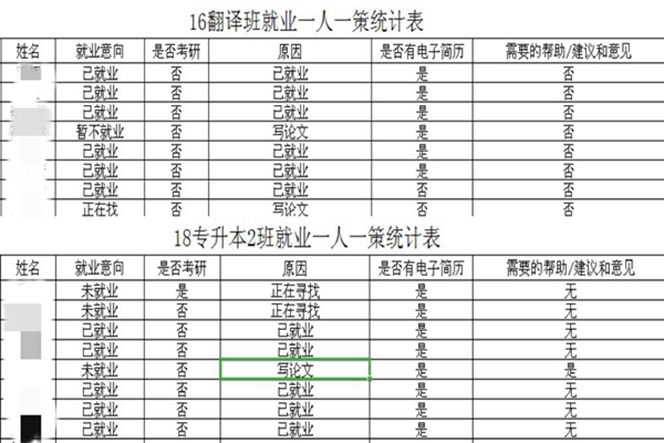 各毕业班定期召开在线主题班会,及时传达各级各类就业政策和就业信息。毕业班班主任通过“一对一”“人盯人”等行之有效的做法,让全体毕业生感受到学校和学院对毕业生就业工作的重视、对毕业生的关心关爱。毕业班辅导员通过就业意向调查、就业状况统计等,精准掌握每一名毕业生的信息,并建立数据库,着力强化重点帮扶,做好家庭贫困、孤儿、心理异常学生等特殊群体的就业帮扶工作。辅导员还通过电话、短信、QQ、微信等多种方式,深入、广泛动员毕业生积极参与网络就业指导课程学习和网络招聘活动。实现毕业生线上有指导、在家有帮扶、信息有沟通。