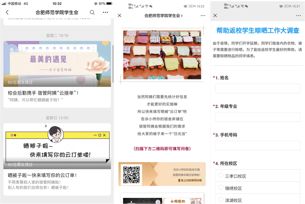 五四期间,院团委在线上开展“云青年云反馈”活动,活动一经发出就得到了同学们的广泛响应。其中一些即将返校的毕业生同学表示,希望学院可以帮忙晒被子。院团委在接到相关反馈后,经与后勤处、学生工作处协商,迅速行动,利用线上平台,按照自愿报名的原则,摸排晾晒被褥的学生需求。根据报名情况,本次共服务166名同学。