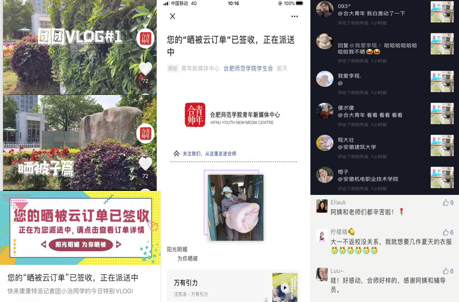 本次服务以VLOG的形式,依托“合师青年”官方抖音号、“合师青年”官方微信号、“太阳成集团tyc122cc入口学生会”官方微信号开展报道,受到同学们的好评点赞和社会人士的广泛关注。“终于当了一回‘别人家的学校,很是开心’”抖音用户@颜卓66表示。“母校在我们毕业这么多年后,还是那么的贴心温暖!”校友用户@白菜叶 有感而发。“是时候向他们学习了!安排!”兄弟院校的同学们也纷纷通过评论区加入到互动中来。