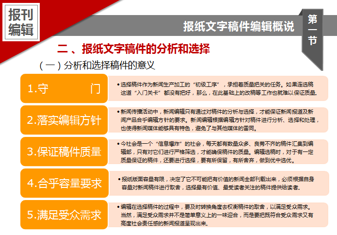 什么是编辑?一个合格的编辑需要具备哪些素质?这是第一次课上夏老师提出的问题,他让同学们尽情发表自己的观点。有人说编辑是一种工作类别,也是一种职业身份;有人说编辑是对稿件和作品的修改、排版;有人说编辑像是一个幕后工作者,很多人不知道编辑做了什么,但他们却不可或缺;有人说编辑有敏锐的市场感知力和独特的捕捉能力,是价值的发现者……在老师的引导下,每一位同学都表达着自己内心关于编辑的理解。老师告诉我们,编辑工作远远没有我们想象中那么简单,编辑的过程很复杂,也很考验编辑的能力。“编辑的工作往往有策划新闻报道、分析和选择稿件、修改稿件、设计版面、校对等十几个流程,而且编辑在选择稿件时,要根据报纸定位、宣传政策、版面定位等依据严格挑选,同时也要注重政治、社会、法律、道德等效果……”而合格的编辑,也必须具有高度的政治意识和专业素养,以及良好的责任意识和沟通能力。一个优秀的编辑一定是热爱编辑事业、对工作充满责任心、具备专业素养的人。